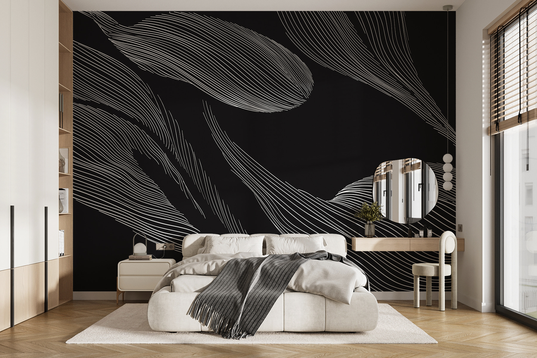Proměňte svůj prostor pomocí této úžasné černobílé nástěnné malby s listy, která tančí po stěně. Je to jako přenést přírodu do interiéru, bez brouků – bonusové body! Plynulé linie nabízejí pocit pohybu a připomínají jemný vánek šustící listím. Ideální do útulného čtecího koutku nebo moderního obývacího pokoje, kde jistě vyvolá konverzaci a možná i trochu snění. Představte si, že se schoulíte s šálkem čaje, obklopeni uklidňujícími vibracemi tohoto uměleckého díla. Kdo by řekl, že nástěnná malba dokáže proměnit celou stěnu v náladu?