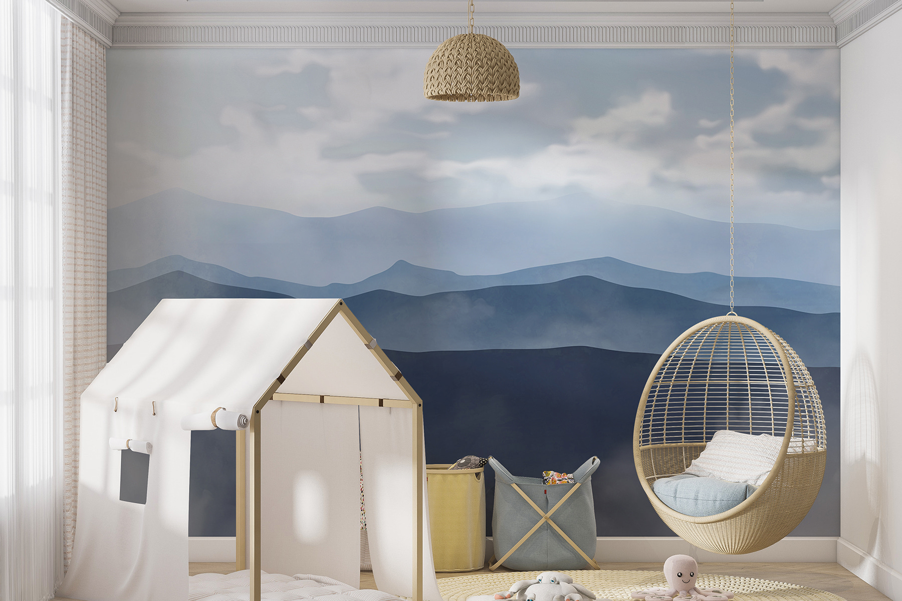 Proměňte každou místnost v útulné útočiště pomocí této úžasné nástěnné malby horských masivů. Představte si, že se probouzíte s jemnou modří a jemnou šedí vzdálených vrcholů, zatímco se uvelebujete ve svém oblíbeném křesle s kávou v ruce. Mraky nad vámi hravě víří a vytvářejí pocit klidu – téměř jako by hory šeptaly vaše jméno. Ideální do obývacího pokoje, ložnice nebo malého čtecího koutku, o kterém stále sníte. Ať už je zimní chlad, nebo letní horko, tato nástěnná malba přináší osvěžující atmosféru, která je tak akorát. Je to jako mini útěk do přírody, přímo u vás doma!
