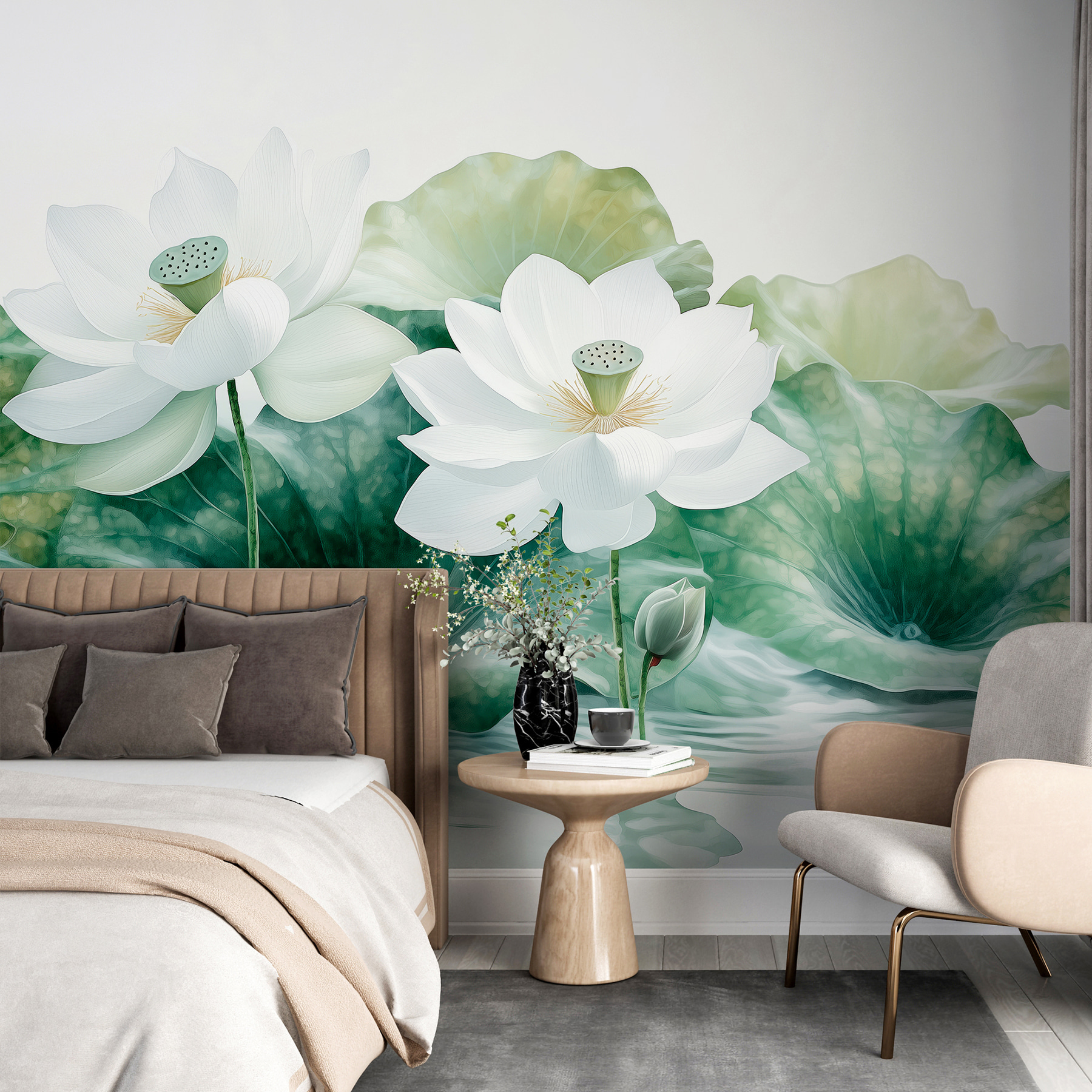 Ahoj! Podívejte se na tuto úžasnou fototapetu “Fototapeta w01448”. Představte si, že máte tuto krásu na zdi! Jsou na ní klidné bílé květy rozkvétající nad svěžími zelenými listy, to vše v jemném akvarelovém stylu, který je tak uklidňující. Ideální pro každého, kdo miluje dotek přírody v interiéru. Dokážete si to představit? Vejdete do místnosti a okamžitě se cítíte trochu víc v pohodě – skoro jako mini dovolená pro vaši mysl.