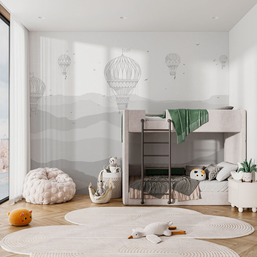Jemné hory v odstínech šedé a vzdušné balóny téměř přinášejí na mysl jemný vánek – necítíte to? Možná popíjíte ranní kávu nebo odpočíváte po dlouhém dni, díváte se na tuto nástěnnou malbu… a najednou jste ve výšce 10 000 stop a plujete mezi mraky. Není to jen dekorace na stěnu, je to celá atmosféra – jemná, zasněná a tak trochu magická… přesně taková, jakou jste nikdy netušili, že váš prostor potřebuje!
