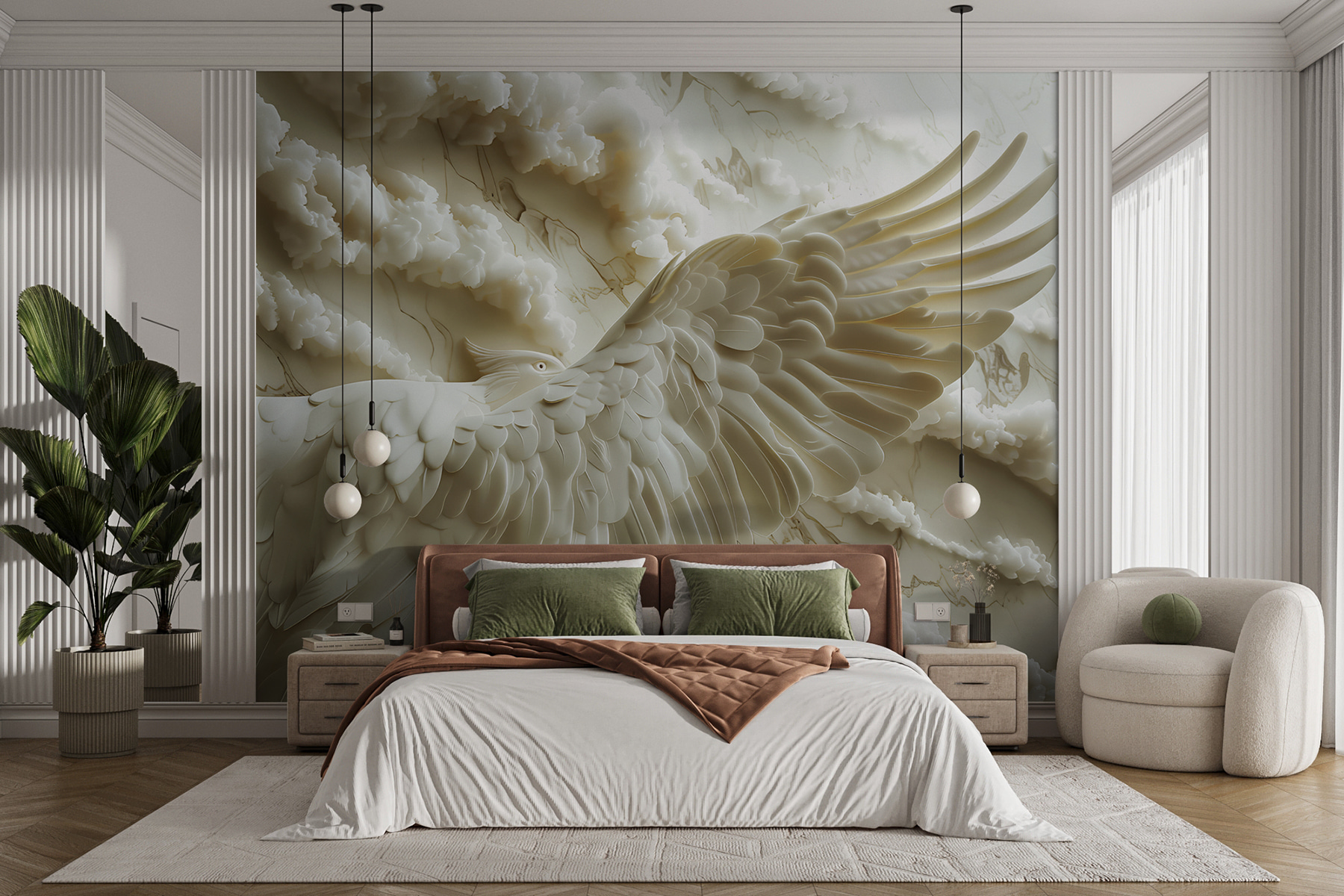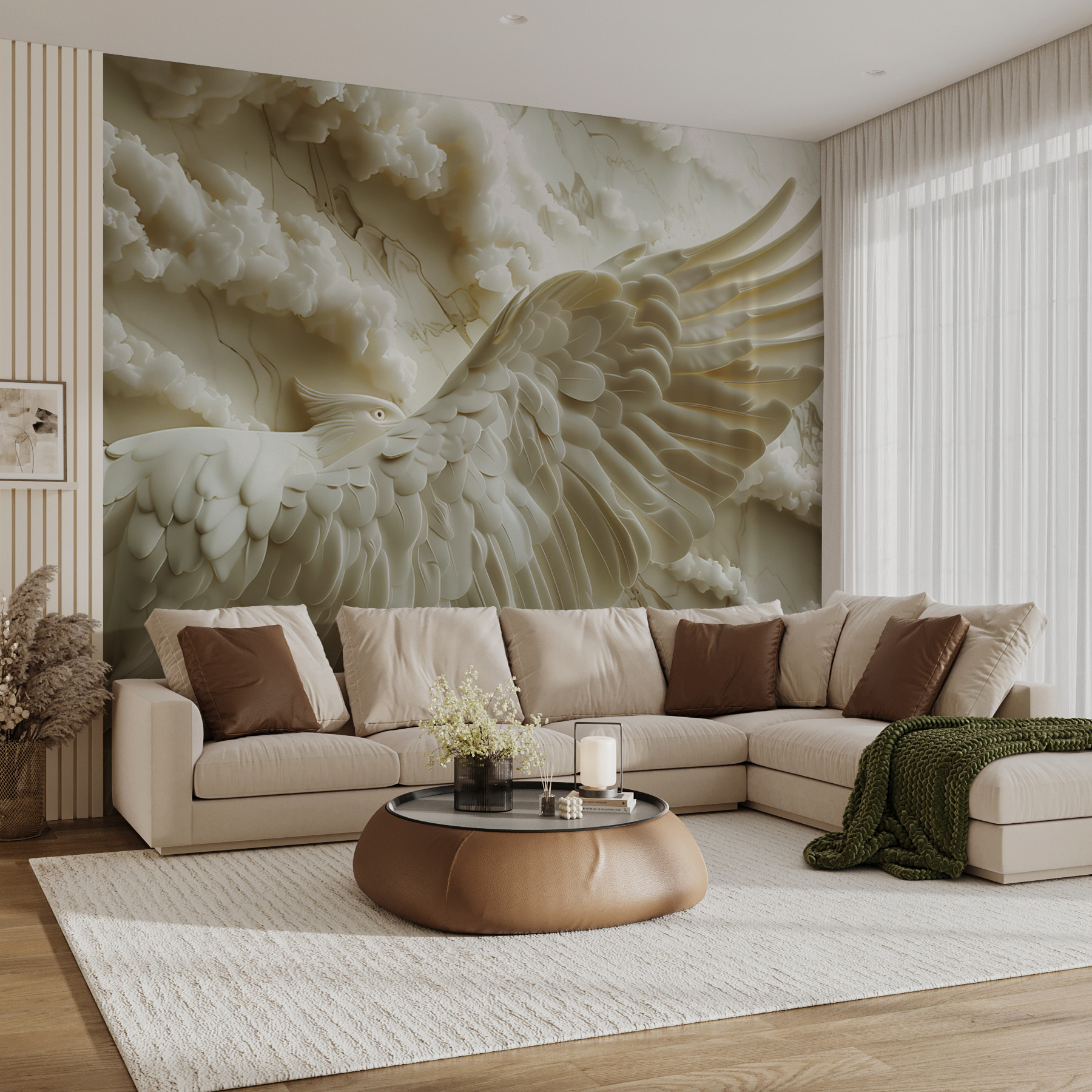 Proměňte každou místnost v klidné útočiště s nástěnnou malbou “Bílý pták s roztaženými křídly”. Tento úchvatný kousek zachycuje půvab ptáka v letu, obklopeného měkkými plynoucími mraky. Představte si, že vstoupíte do svého prostoru a okamžitě pocítíte pocit klidu, jako byste se dívali na klidnou oblohu.