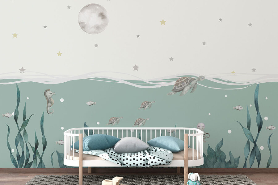 Představte si, že se při každém vstupu do místnosti ponoříte do klidného podmořského světa. Tato nástěnná malba “Mořské řasy & mořští koníci” zachycuje jemný tanec mořských tvorů pod hvězdnou noční oblohou. Je to, jako by se vaše stěny slastně ponořily do oceánu. Ideální pro jakýkoli prostor, který potřebuje nádech rozmarnosti nebo uklidňující atmosféru. Kdo by navíc nechtěl při popíjení ranní kávy sledovat, jak kolem něj kloužou drobné želvy? Jen do toho – přidejte do svého interiéru kapku mořského pobřeží a nechte svou fantazii volně plout!
