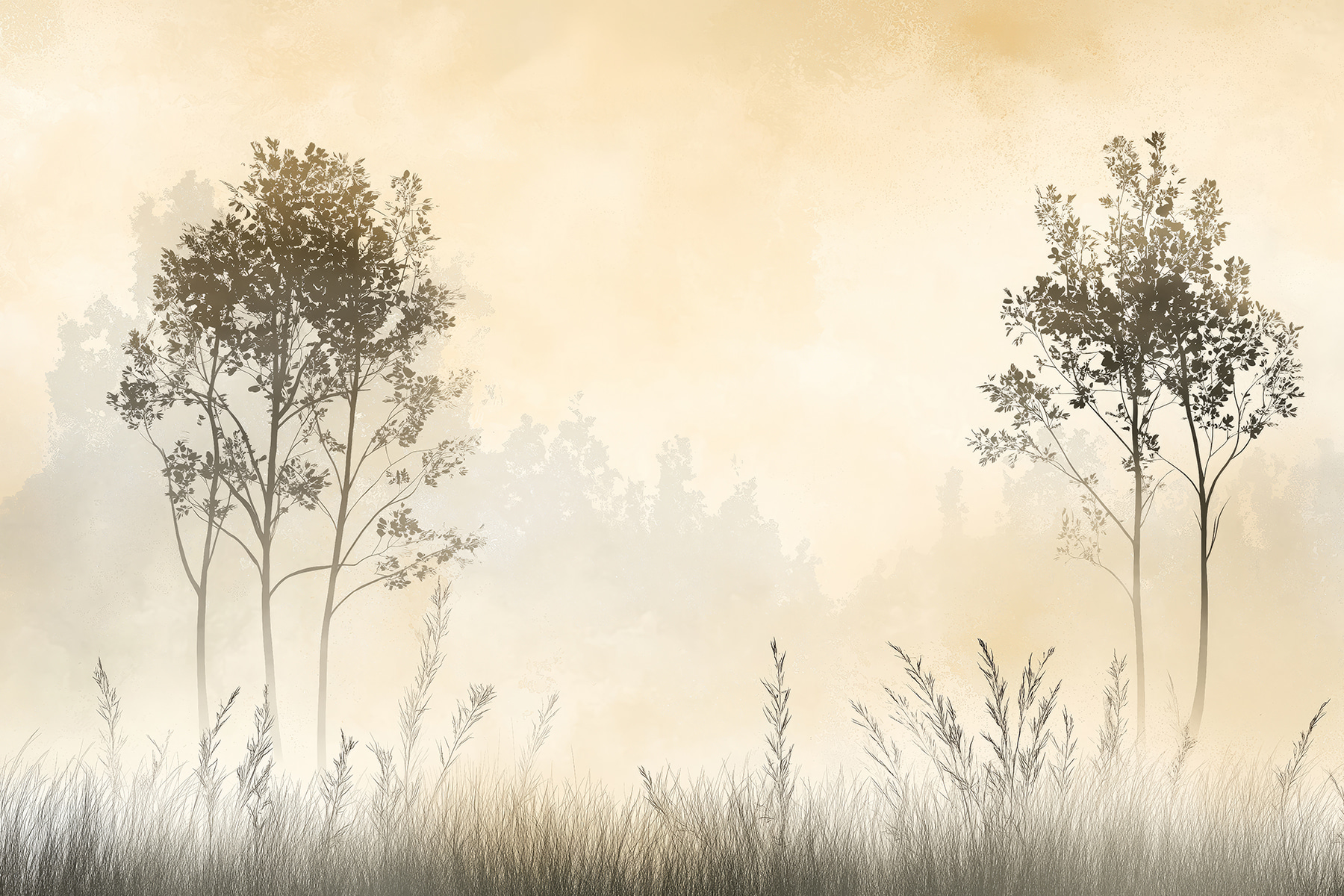 Fototapeta Mlžná krajina se stromy a trávou Fototapeta Mlžná krajina se stromy a trávou
