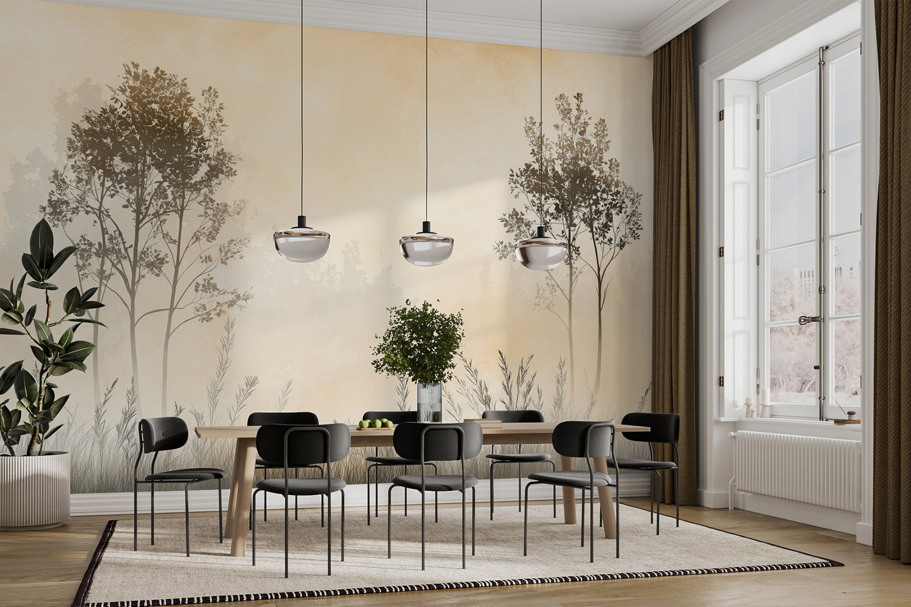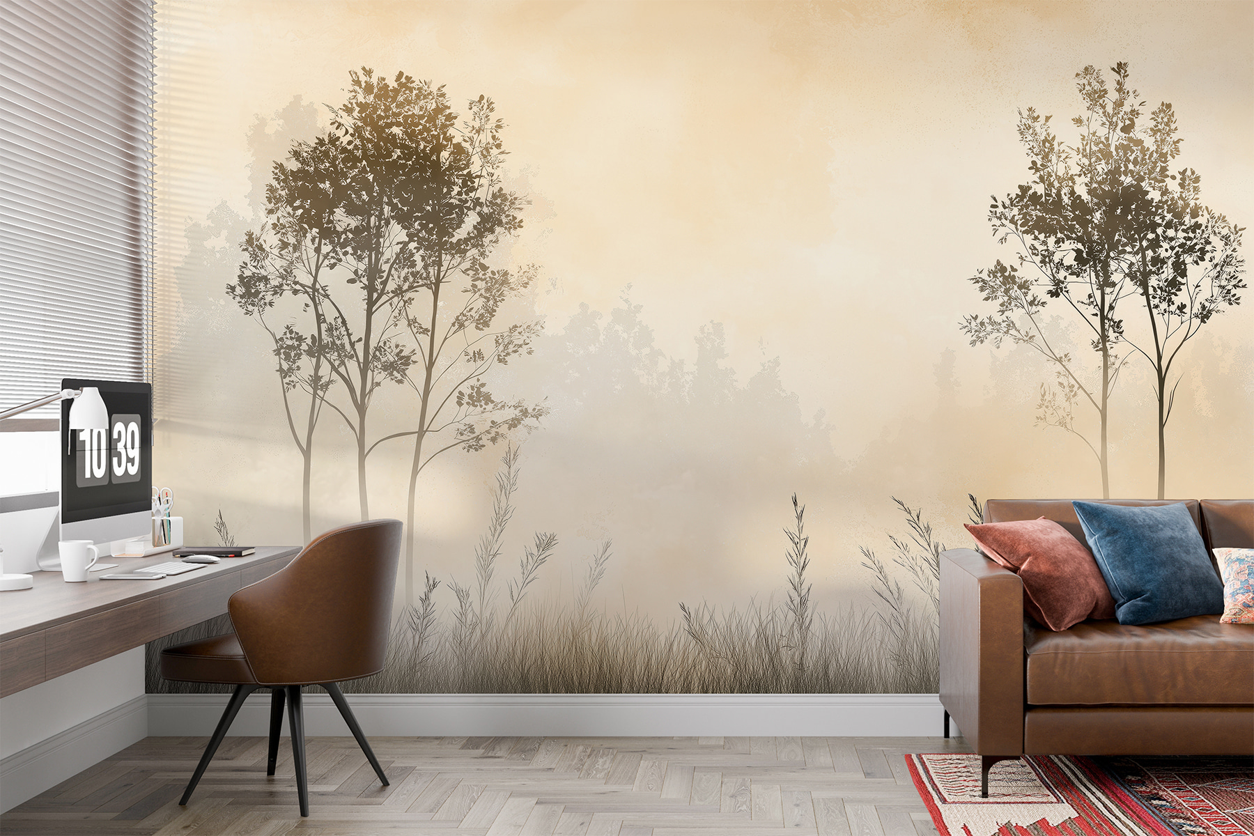 Představte si, že se probudíte s touto snovou freskou – “Mlžná krajina se stromy a trávou”. Je to jako vstoupit do klidného lesa přímo z vašeho obývacího pokoje. Znáte tu uklidňující atmosféru klidného rána? Tohle ji dokonale vystihuje. Měkká mlha obklopuje půvabné stromy, mezi nimiž vykukují náznaky trávy. Ideální pro proměnu obyčejné stěny ve vlastní klidné útočiště.