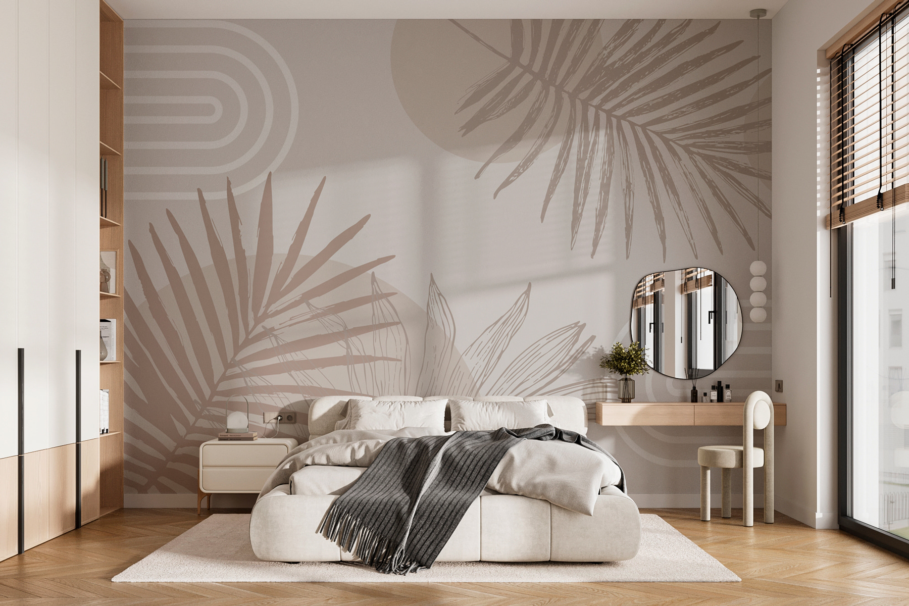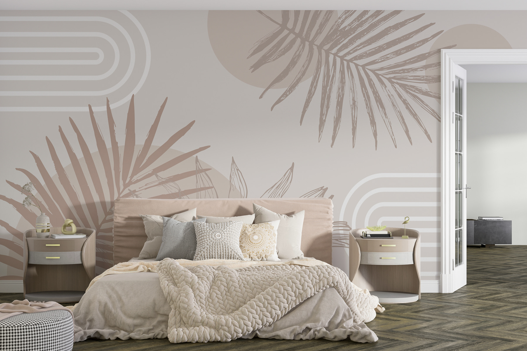 Podívejte se na tuto báječnou nástěnnou malbu – je v neutrálních tónech s veselými geometrickými tvary a palmovými listy. Představte si to: líné nedělní ráno, káva v ruce a klidná atmosféra, kterou tato nástěnná malba přináší. Je to jako mini dovolená přímo na vaší zdi. Ideální pro ty, kteří touží po troše tropů bez zpoždění. Ať už předěláváte obývací pokoj, nebo vylepšujete domácí kancelář, tento design dodá vašemu interiéru styl a zároveň zašeptá: “Odpočiňte si, jste doma.” Vaše stěny si ho zamilují!