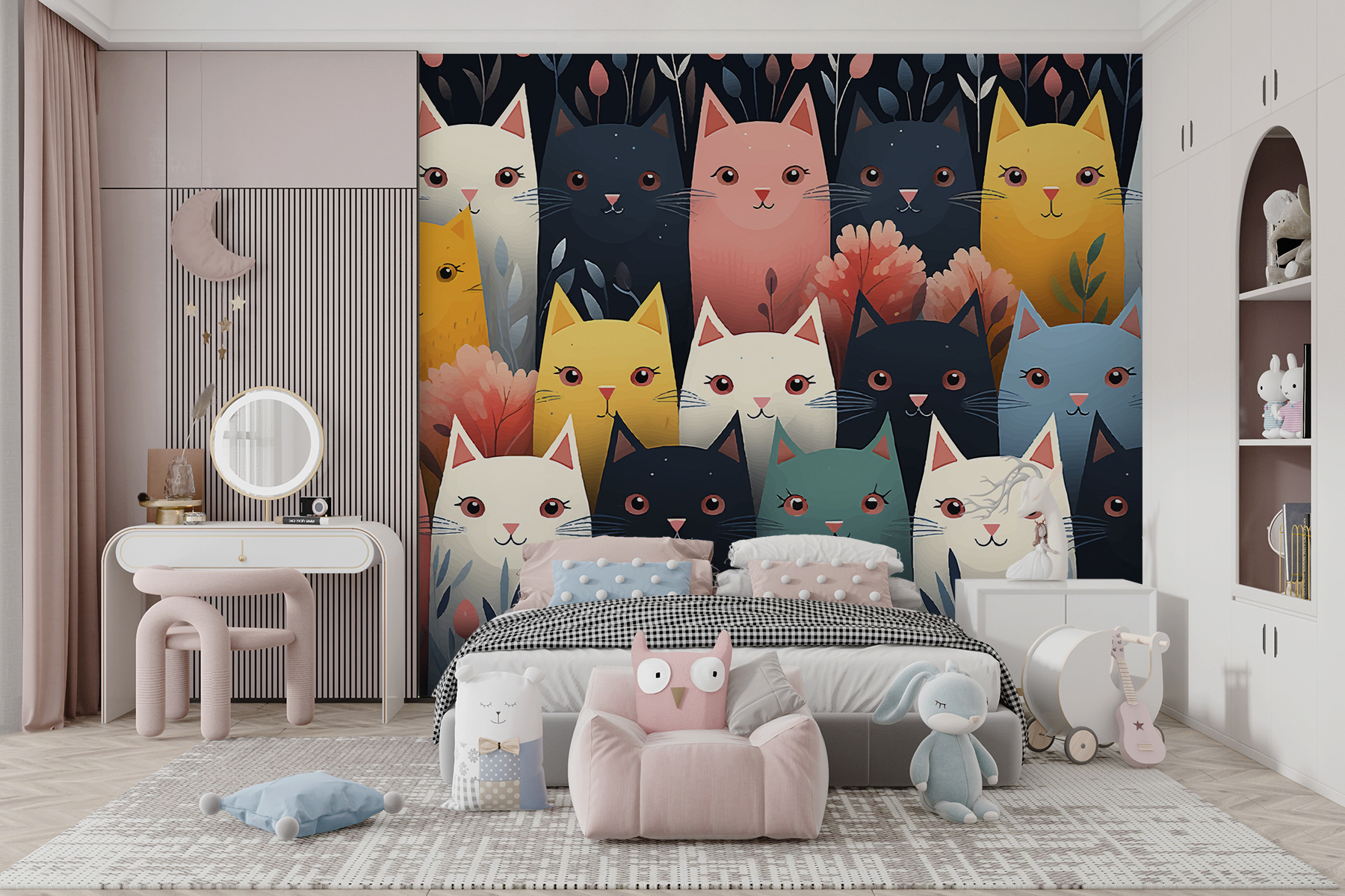 Chcete do svého prostoru vnést trochu rozmarů? Podívejte se na tuto hravou nástěnnou malbu s názvem “Skupina koček s květinami”. Představte si skupinu barevných kočiček – jasně růžové, zelené a žluté – usazených mezi veselými květinami. Je to jako zahradní párty, ale s kočkami! Ideální pro každého, kdo miluje barevné nálady a kapku radosti. Tito kočičí kamarádi vnesou do každé místnosti šarm a nádech rošťáctví a polechtají vašeho tvůrčího ducha pokaždé, když projdete kolem. Přemýšlíte o zřízení útulného zákoutí? Tyto kočky vám kryjí záda – nebo alespoň vaši zeď!