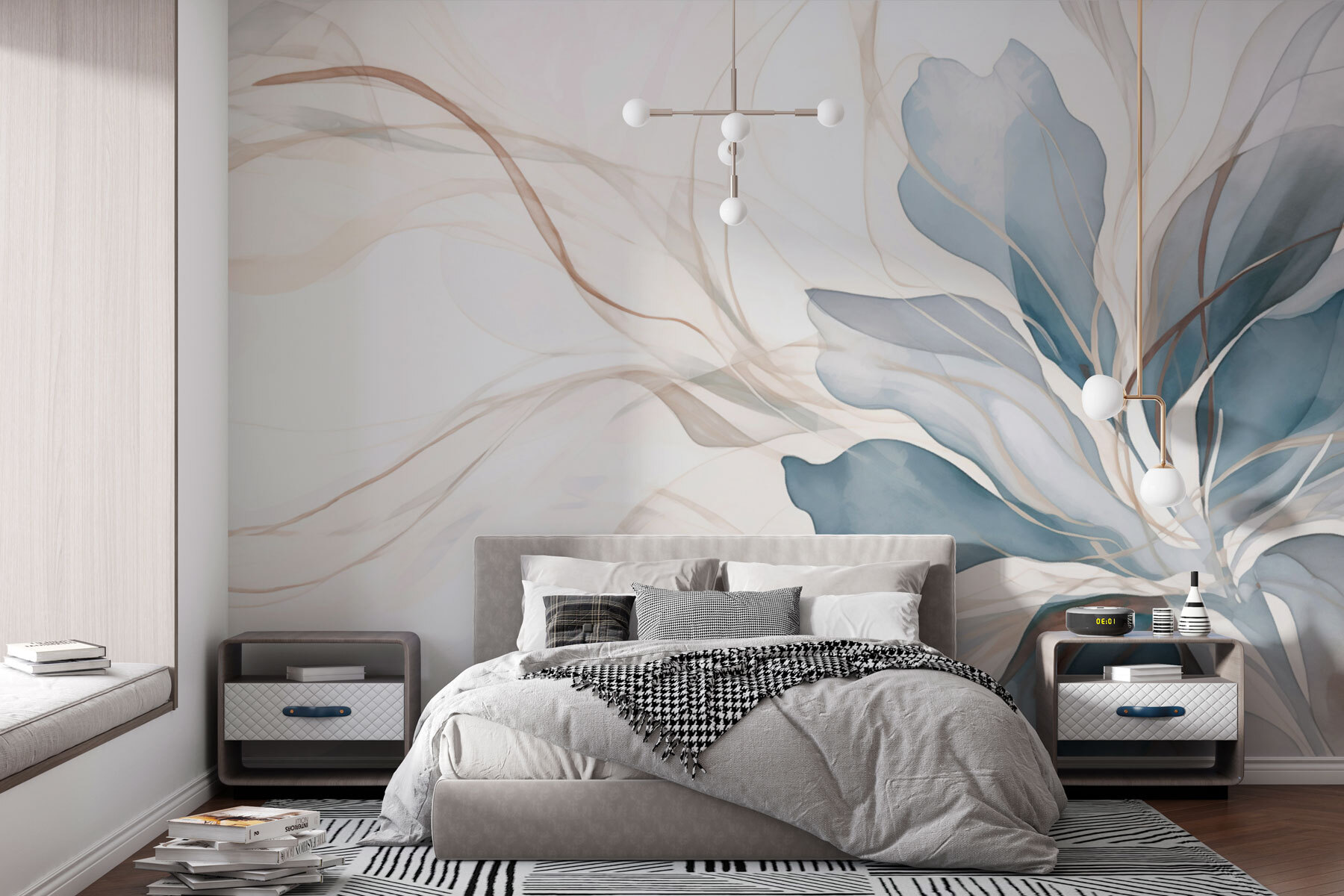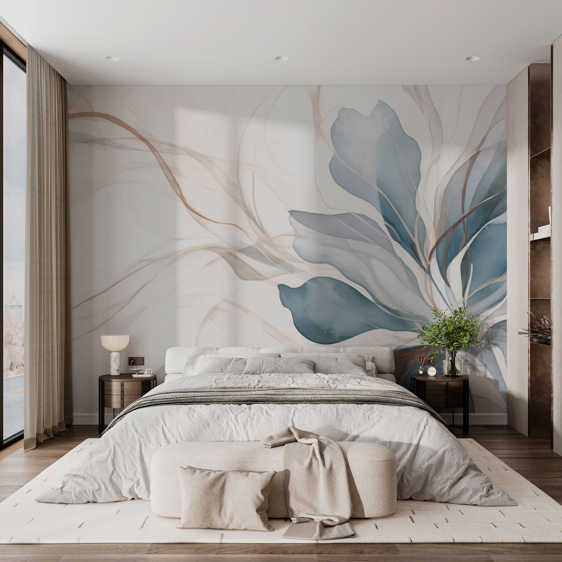 S touto éterickou květinovou fototapetou proměníte každou stěnu v klidné útočiště. Představte si, že se probouzíte do jemné modři a šepotu zemitých tónů, které vytvářejí klidnou atmosféru, jež působí jako jemné objetí. Je to jako přenést si klidnou zahradu přímo do svého obytného prostoru. Tato nástěnná malba, která se skvěle hodí do rohového zákoutí nebo je dostatečně odvážná, aby se stala výraznou stěnou, jiskří radostí a teplem. Přátelé se možná zastaví uprostřed věty, uchváceni snovým uměním. Ať už popíjíte kávu nebo se choulíte do klubíčka s knihou, dodá vám šmrnc přírody, který by mohl rozjasnit i ty nejchmurnější dny.
