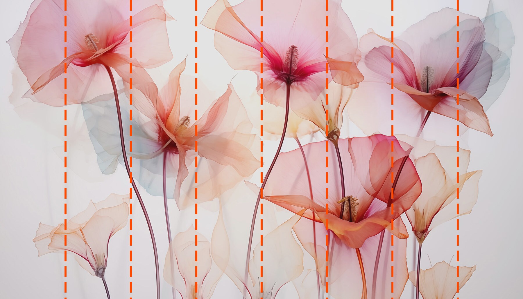 Tapety budou připraveny podle rozměrů uvedených v procesu objednávání. Plátno bude rozděleno na vhodné části, každá o šířce až 50 cm.