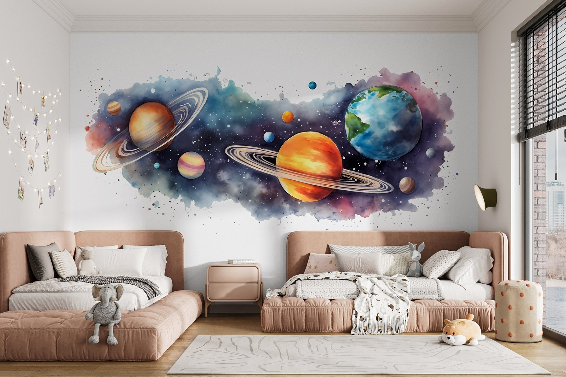 Snili jste někdy o tom, že budete objevovat vesmír z vlastního obývacího pokoje? Tato nástěnná malba “Planety a hvězdy” přenese vesmír přímo na vaše stěny – aniž byste k tomu potřebovali vesmírnou loď! Představte si, že popíjíte ranní kávu a společnost vám dělají Saturn a Jupiter. Je to jako sedět v první řadě v galaxii. Děti i dospělí pocítí příval hvězdného úžasu pokaždé, když projdou kolem. Ideální pro dodání špetky tajemství a úžasu do jakéhokoli prostoru. Bonus: nulová gravitace. Kdo by řekl, že interiérový design může být tak hvězdný?