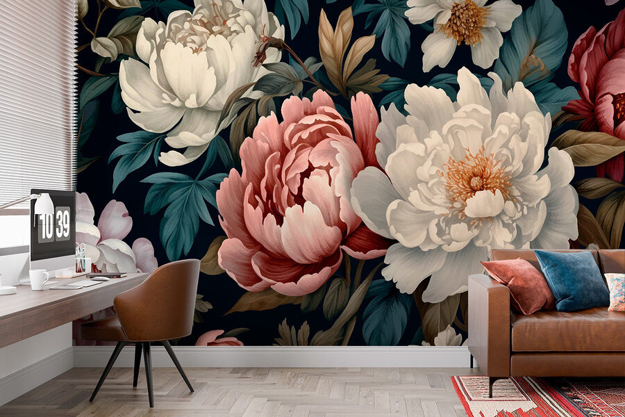 Proměna místnosti pomocí nástěnné malby “Elegantní květinová symfonie v květu” je jako pozvání nejlépe střežených tajemství přírody do interiéru. Představte si, že vstoupíte do zahrady, kde se pivoňky jemně pohupují a tančí a jejich svěží okvětní lístky vás vyzývají k bližšímu pohledu. Hluboké odstíny vytvářejí útulnou atmosféru, která je ideální pro posezení s knihou nebo šálek kávy s přítelem. Není to jen tapeta, je to podnět ke konverzaci, kulisa pro vzpomínky. Malá kapka květinového potěšení dokáže proměnit jakoukoli stěnu v živoucí ústřední bod, téměř jako by se sama matka příroda rozhodla zastavit na návštěvu.