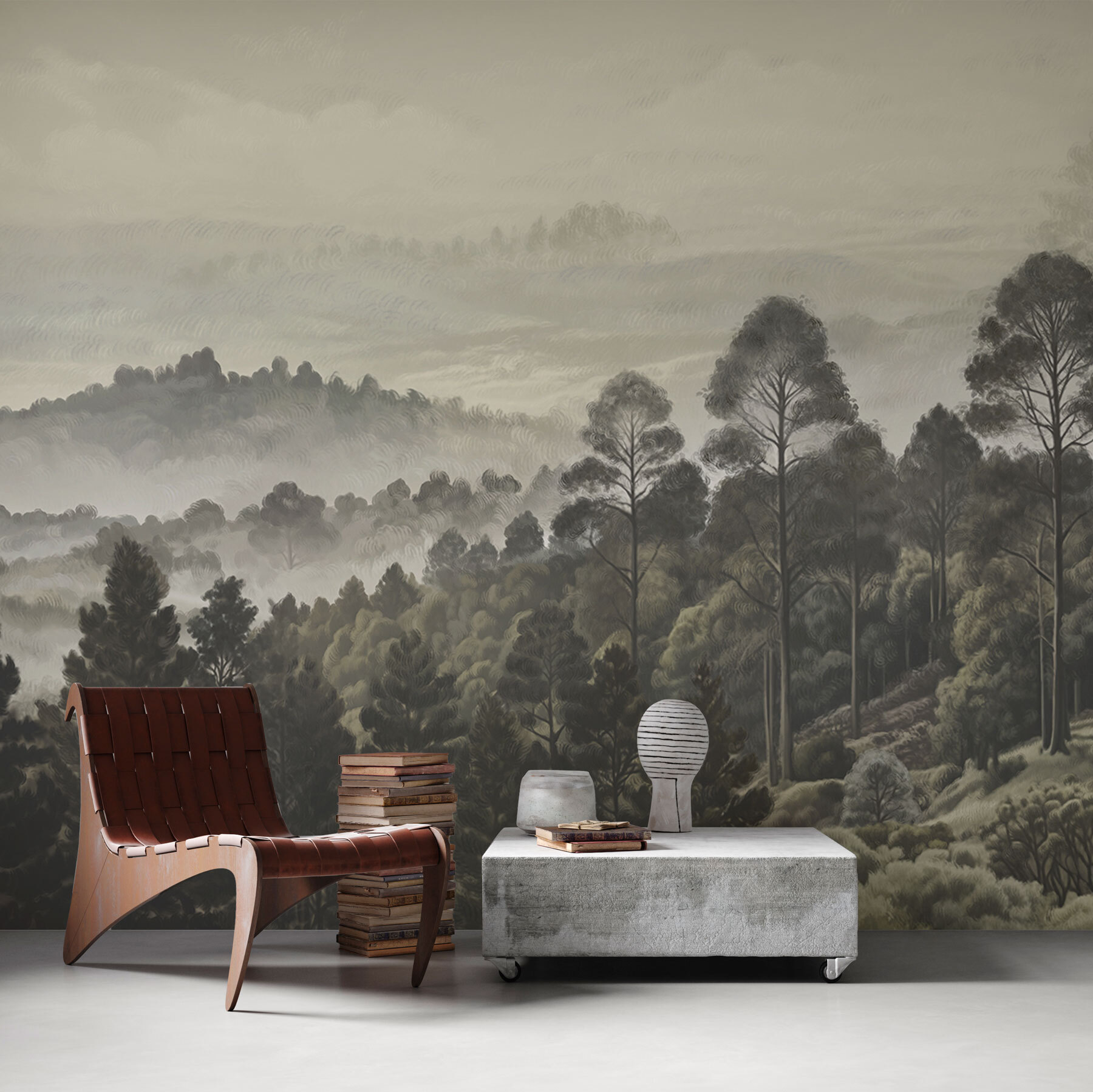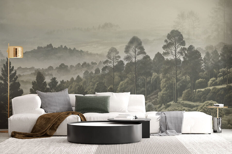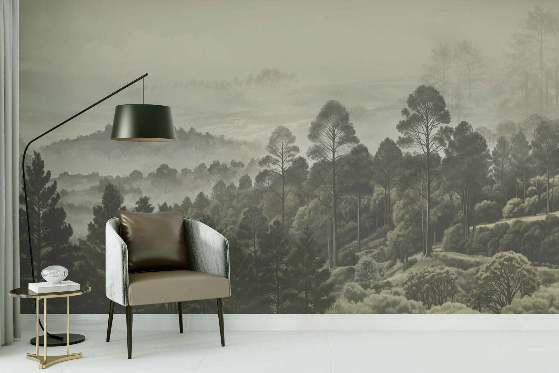 Představte si, že popíjíte kávu v obývacím pokoji, ale místo na obyčejnou zeď zíráte na zasněnou fresku se stromy a mlhou. Je to jako zabalit se do útulné, mlhavé ranní procházky lesem – samozřejmě bez brouků. Tlumená zelená a jemná šedá působí jako jemné objetí a vytváří dokonalou relaxační zónu. Možná dokonce zapomenete, že jste uvnitř. Není to jen nástěnná malba, je to atmosféra. Jemný únik, aniž byste museli opustit domov. Jen se nedivte, když se vaši hosté zdrží o něco déle!