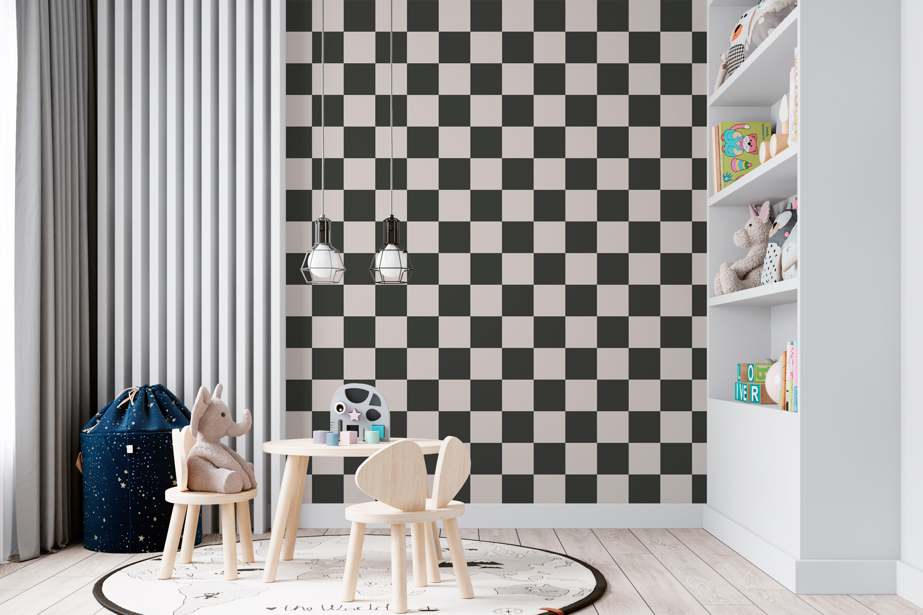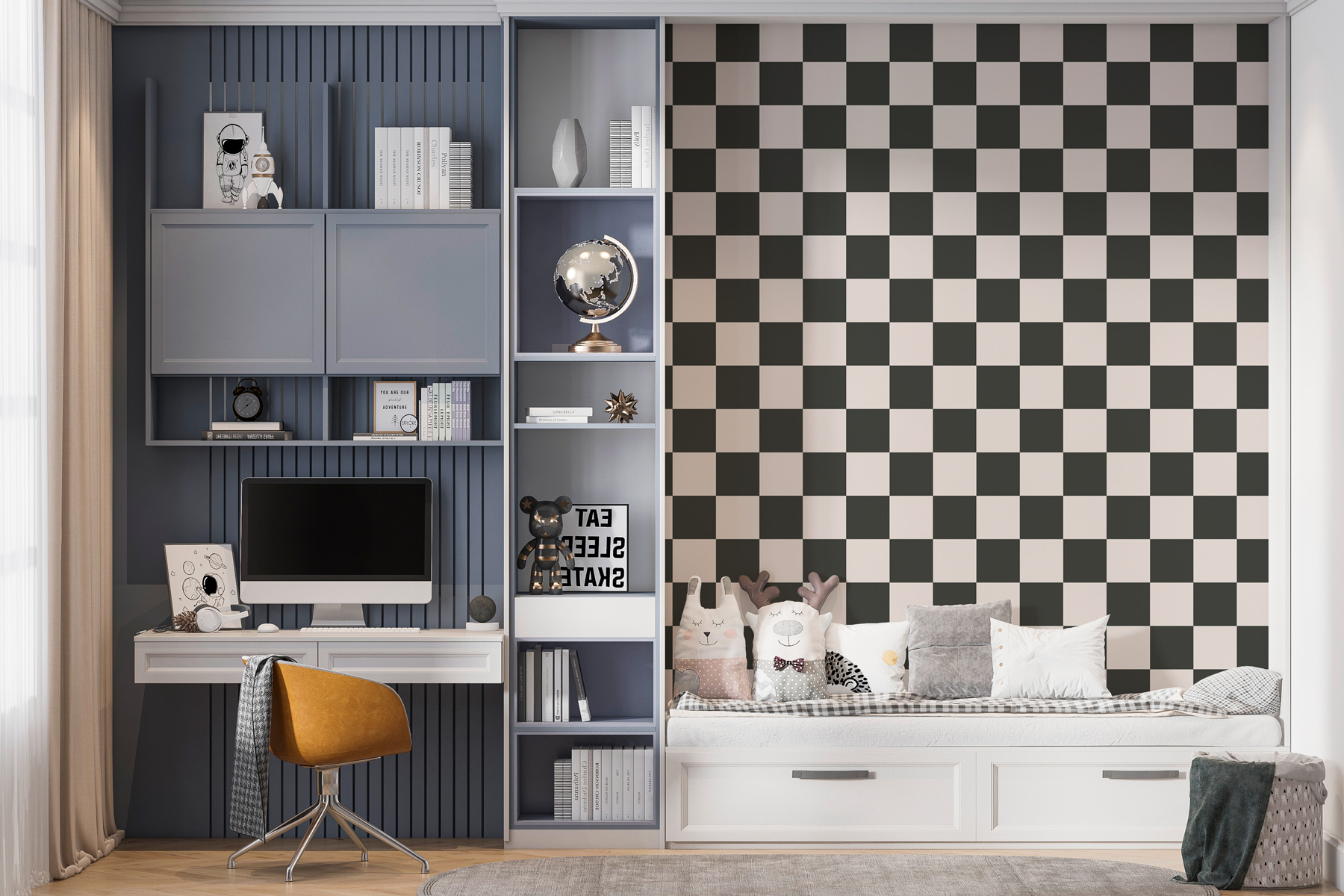 Proměna prostoru může působit trochu jako kouzlo, že? Tato nástěnná malba s výrazným černobílým šachovnicovým vzorem je jako vstoupit do sofistikované šachové partie. Představte si, že vejdete do místnosti, kde stěny našeptávají eleganci a styl – velmi elegantní!