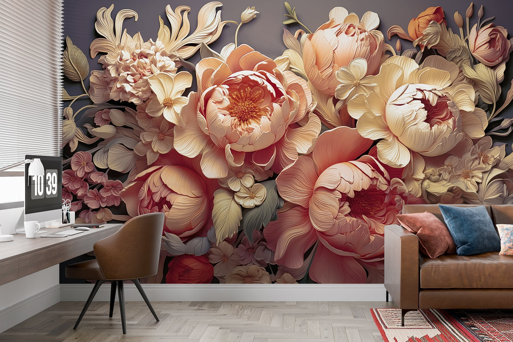 Představte si, že vstoupíte do prostoru, kde na stěnách kvetou živé pivoňky jako na věčné zahradní slavnosti. Tato nástěnná malba s jemným šedým pozadím dokonale zvýrazňuje živé barvy květin a působí svěže a příjemně. Je to jako závan jara, bez ohledu na roční období venku.