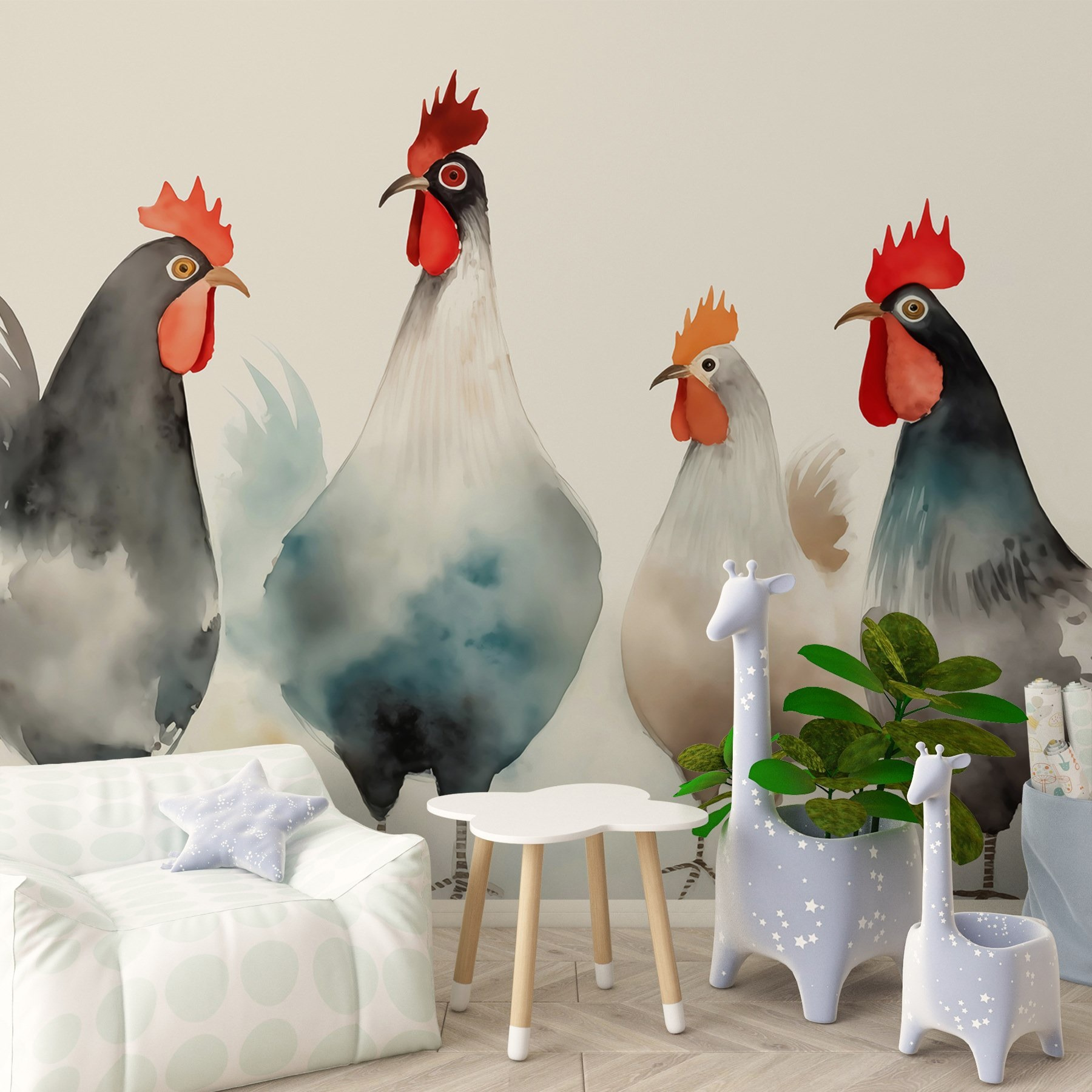 Oživte každý prostor touto nádhernou nástěnnou malbou s bizarní partou kuřat, která se honosí červeným a bílým peřím, jako by právě slezla z módního mola. Jejich živé osobnosti dodají šmrnc humoru a promění obyčejnou stěnu v místo, kde se bude konverzovat. Představte si, že vejdete do místnosti a přivítají vás tito opeření přátelé – je to jako mít doma mini farmu! Tato nástěnná malba, která se skvěle hodí do kuchyně, herny nebo kamkoli jinam, kde je třeba trochu rozveselit, svými jemnými barvami a hravou atmosférou jistě zahřeje u srdce. Navíc, kdo by se neusmíval na kuřecí komando? Je na čase tuto okouzlující dekoraci pěkně přivítat kdákáním!