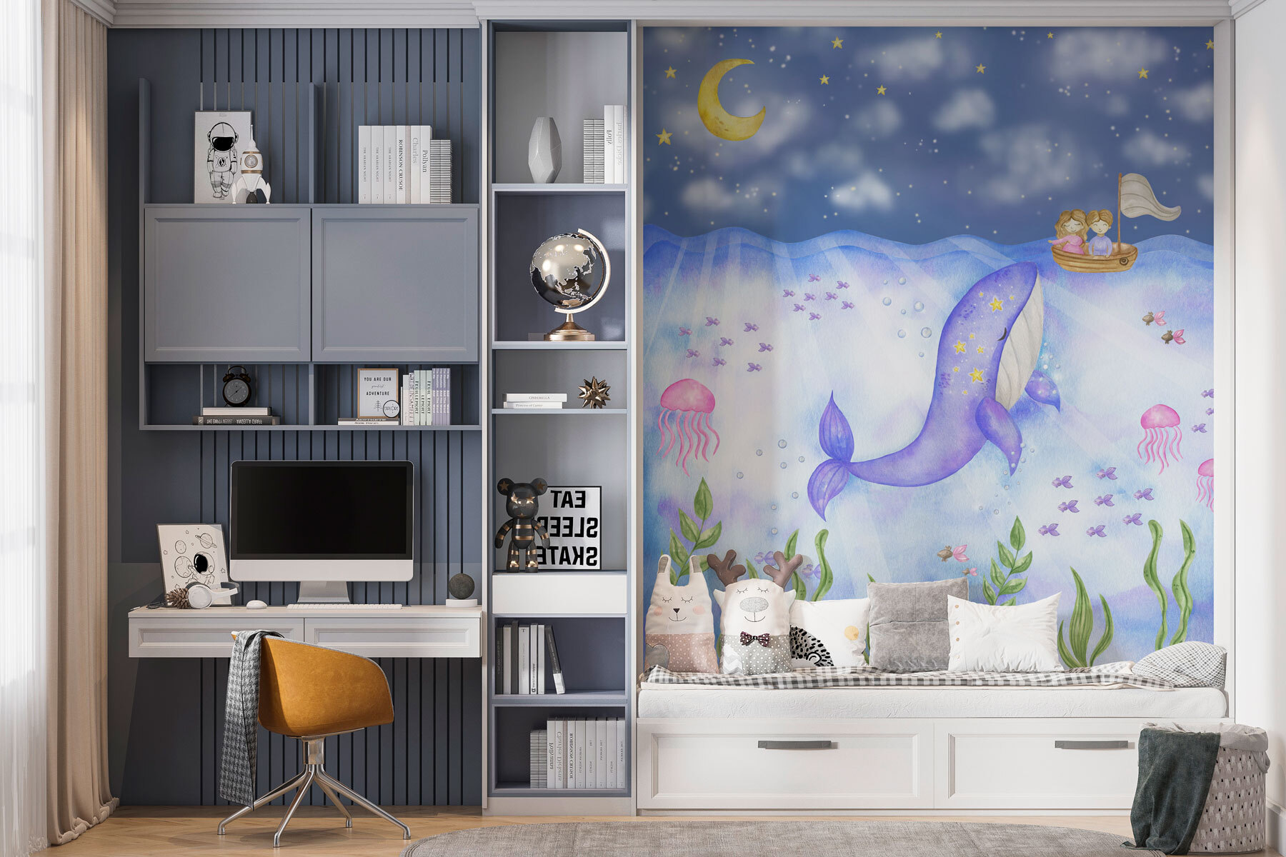 Ponořte se do kouzelného podmořského světa s touto rozmarnou nástěnnou malbou s přátelskou velrybou a hravou medúzou. Představte si jemné pohupování oceánských vln přímo ve svém obývacím pokoji! Jemné odstíny modré a fialové barvy vytvářejí uklidňující atmosféru, která je ideální pro útulný koutek nebo dětský pokoj. Představte si ty nejmenší, jak odplouvají do říše snů, obklopeni snovými hvězdami a bublinkovými dobrodružstvími. Je to jako okno do zázračné oceánské říše, které do vašeho domova vnese kapku radosti a kreativity. Kdo by nechtěl, aby na něj dohlížela veselá velryba?