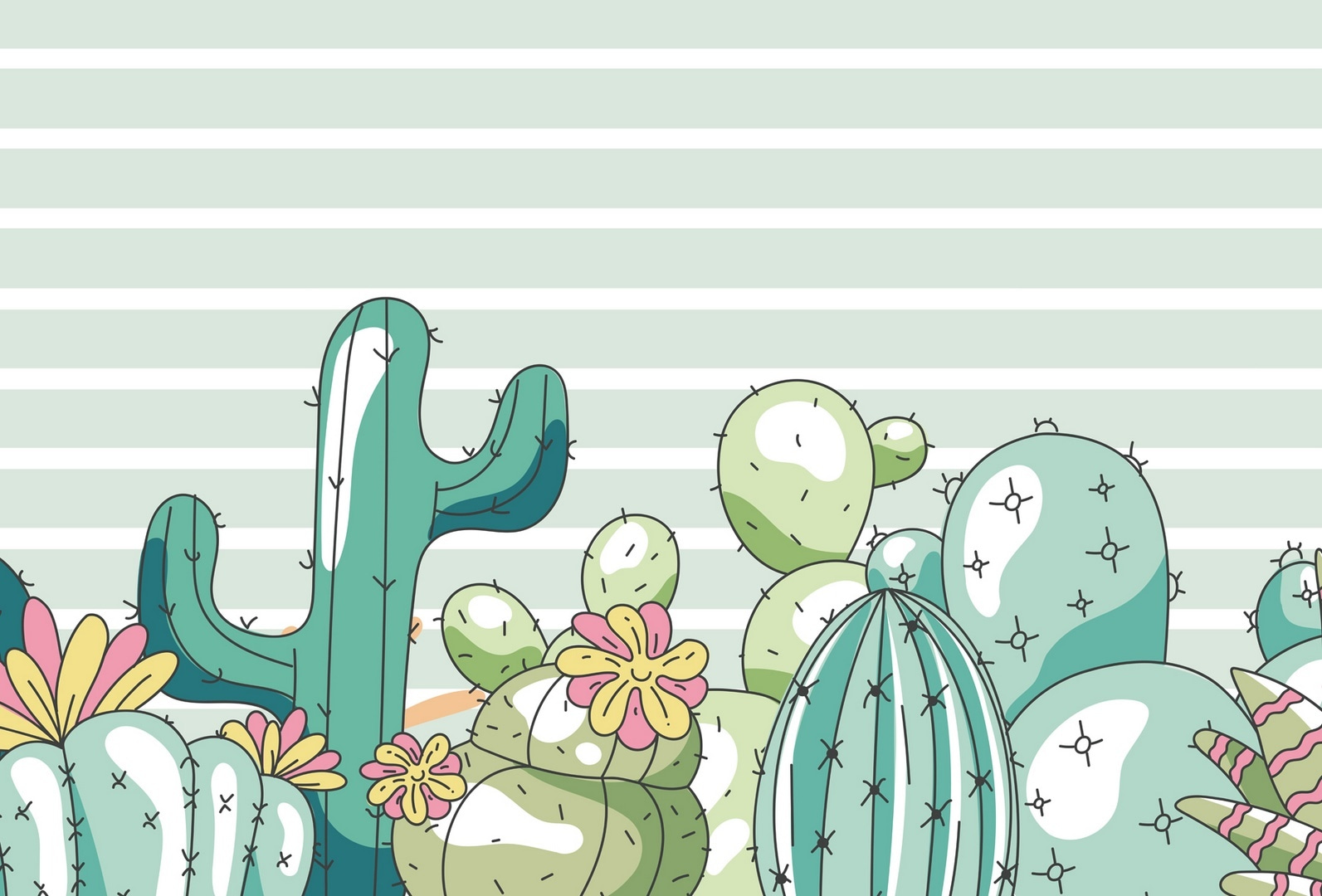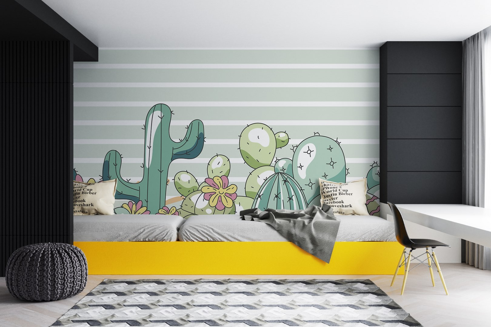 Proměňte každou místnost v hravou oázu s touto nádhernou nástěnnou malbou s živou skupinou kaktusů zdobených veselými květinami. Představte si, že vstoupíte do prostoru, kde tyto nepředvídatelné rostliny přinášejí pocit tepla a zábavy, jako byste měli mini pouštní párty přímo na zdi. Jemné, uklidňující pruhy v pozadí jemně vyvažují zářivé barvy kaktusů, takže je ideální do dětského pokoje nebo útulného čtecího koutku. Je to jako malé tajemství přírody, které vybízí k úsměvu a podněcuje fantazii. Jen si představte děti, jak se pod touto okouzlující nástěnnou malbou choulí s knihou nebo sní o svém dalším dobrodružství v kouzelné zahradě.