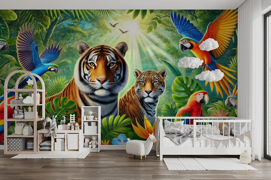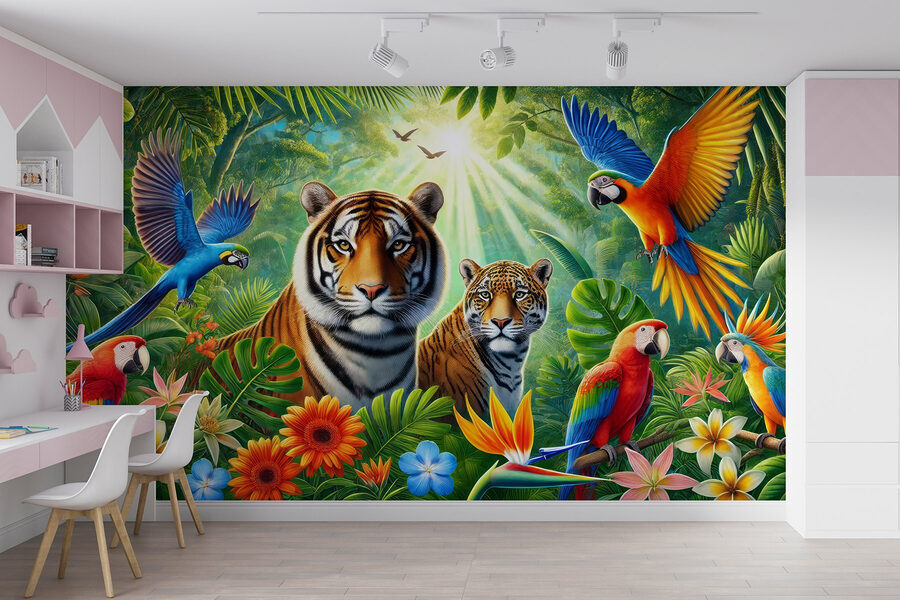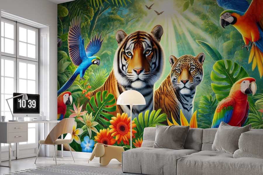 Ponořte se do zázračné džungle s touto úžasnou nástěnnou malbou! Představte si, že se vracíte domů do pulzující scény plné života – tygři se ochlazují a barevní papoušci hrají divadlo. Je to jako dobrodružství přímo ve vašem obývacím pokoji. Téměř slyšíte zvuky šustícího listí a hravého skřehotání. Vyskočte si s touto fototapetou na zeď a váš prostor se rázem stane bujným útočištěm, které je kdykoli připraveno na tropickou dovolenou. Ideální pro ty, kteří milují přírodu nebo jen potřebují ve svém domově rozzářit jiskru. Vážně, kdo by se neusmíval pokaždé, když prochází kolem? Je to pastva pro oči!