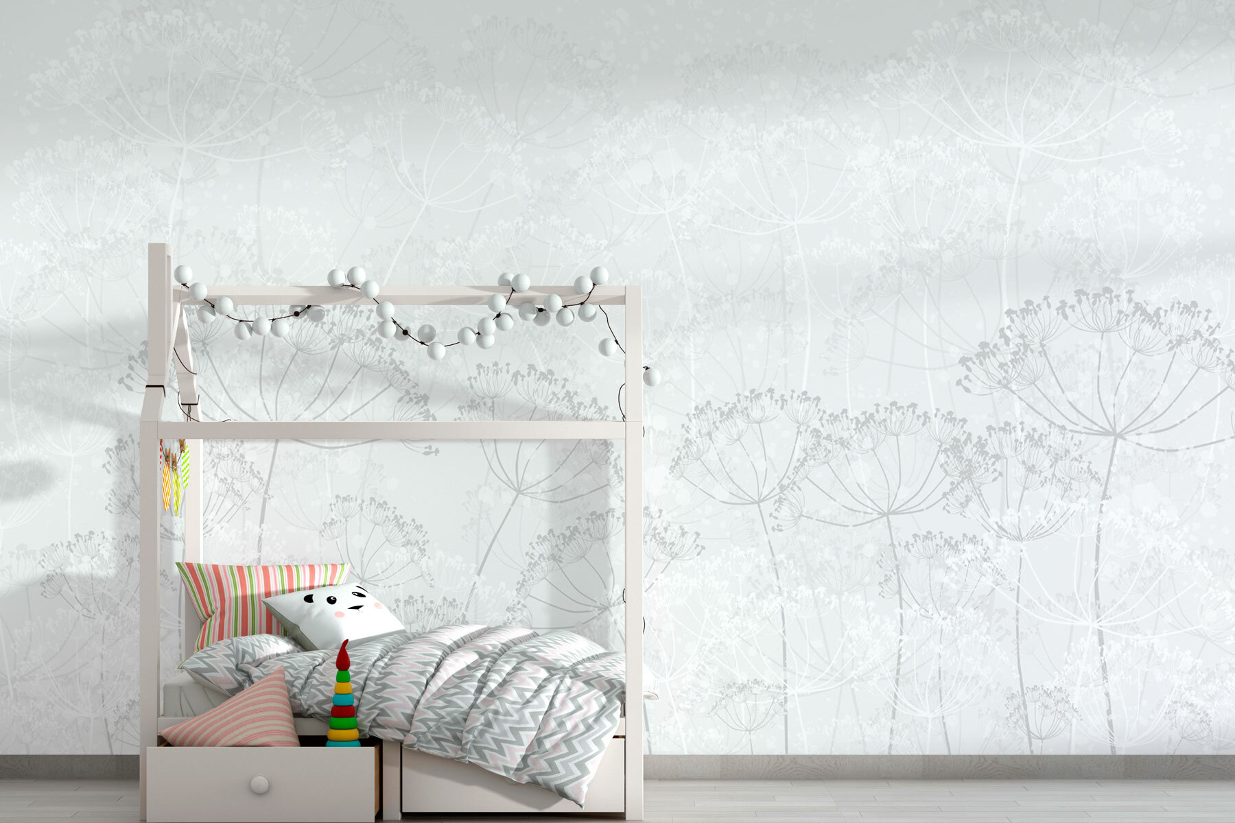 Proměňte svůj prostor pomocí této okouzlující nástěnné malby “Bílé pozadí s květinami”. Představte si, že vstoupíte do klidné zahrady, kde jemné květy šeptají klid. Jemné akvarelové tóny bílé a šedé vytvářejí uklidňující pozadí, které je ideální pro útulný čtecí koutek nebo rozjasnění méně inspirativní chodby.