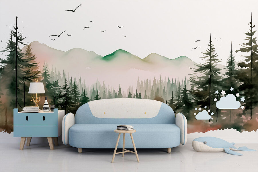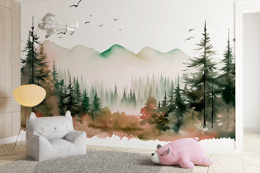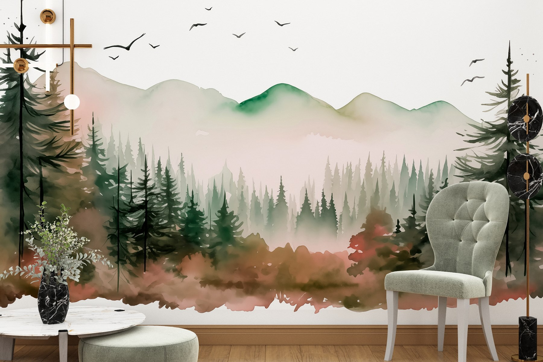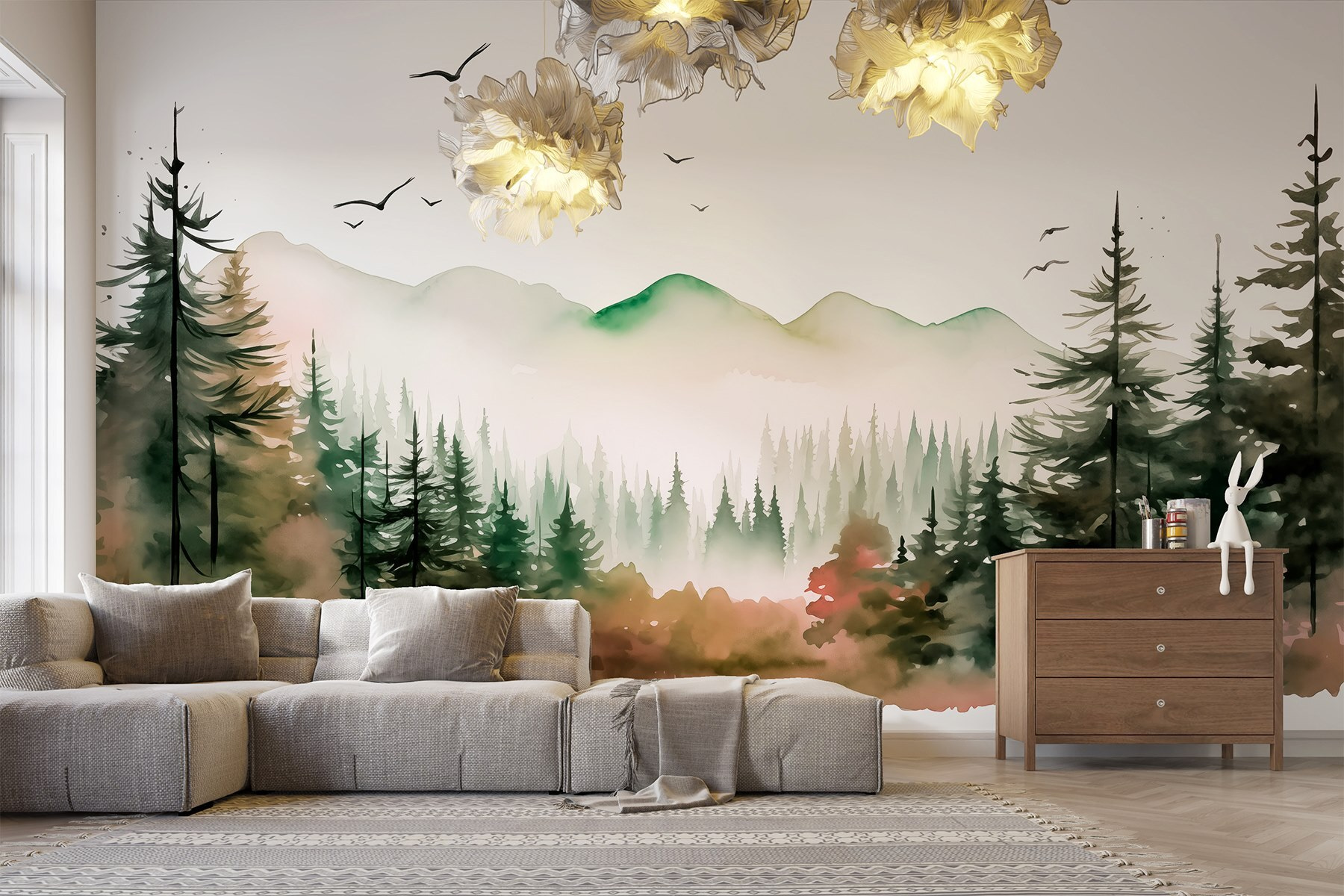 Proměňte svůj prostor pomocí této úžasné akvarelové nástěnné malby se snovým lesem a majestátními horami. Představte si, že se probouzíte do této klidné scény – ptáci se vznášejí a mezi stromy se převaluje jemná mlha. Je to jako přenést si kus přírody do interiéru, bez otravných brouků. Ideální do útulného čtecího koutku nebo na stěnu, která si přímo říká o trochu lásky. Tato nástěnná malba vnese do vašeho pokoje klid a možná vás dokonce inspiruje ke spontánnímu výletu. Jen si to představte: popíjíte kávu a sníte o lesních dobrodružstvích. Skutečný únik!