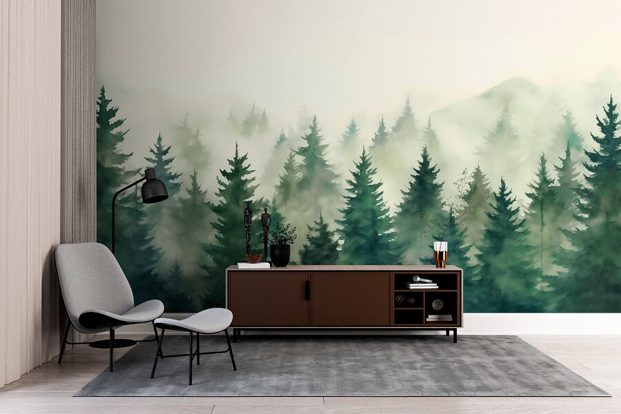 S okouzlující nástěnnou malbou “Skupina stromů v mlze” proměníte každou místnost v klidné útočiště. Tato krásná nástěnná malba jemně zachycuje tajemství mlžného lesa a zve vás ke vstupu do klidné lesní krajiny, kde starosti jednoduše odplouvají. Představte si, že popíjíte ranní kávu a díváte se přitom na ty vysoké majestátní stromy – je to jako přenést si kousek přírody do interiéru.
