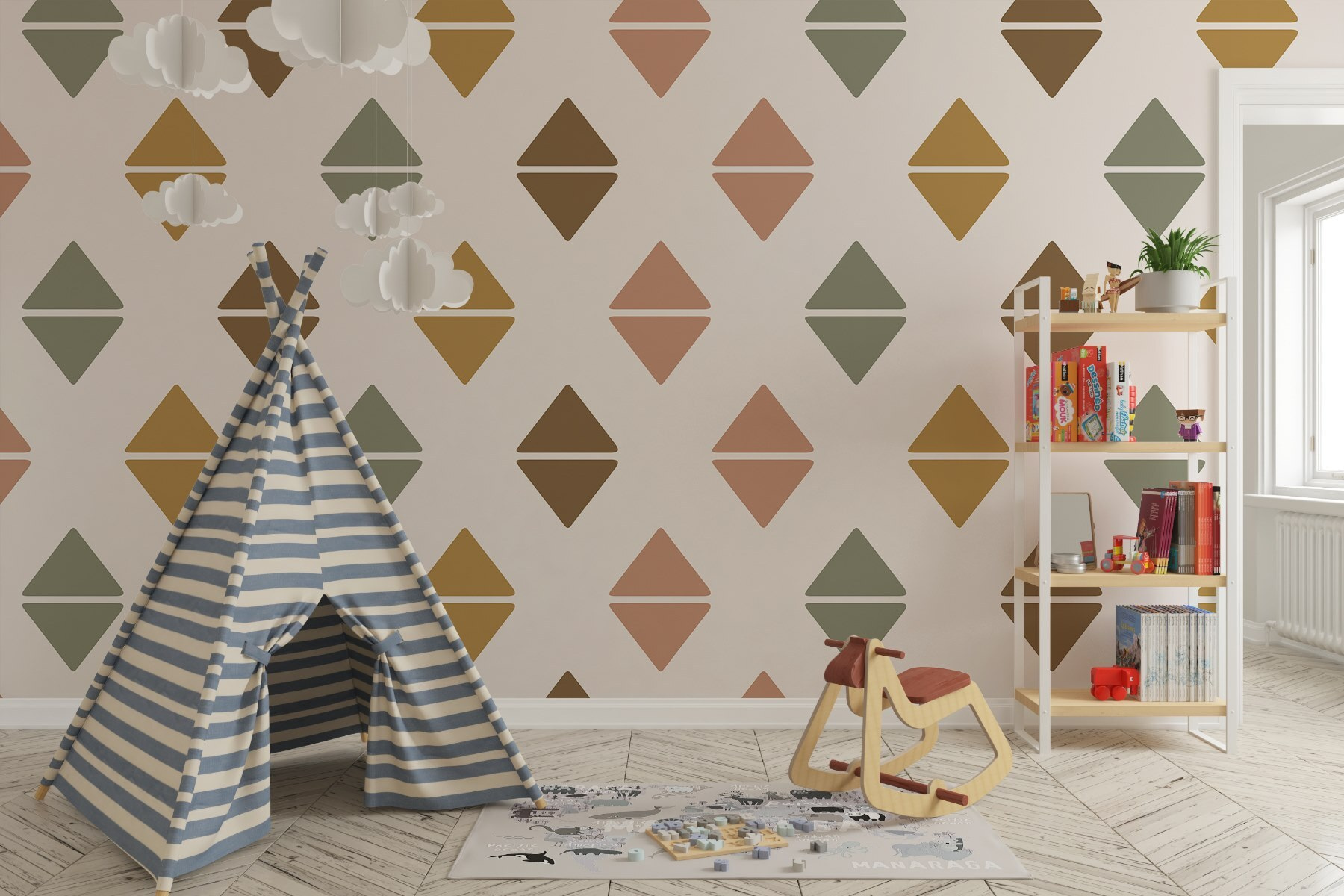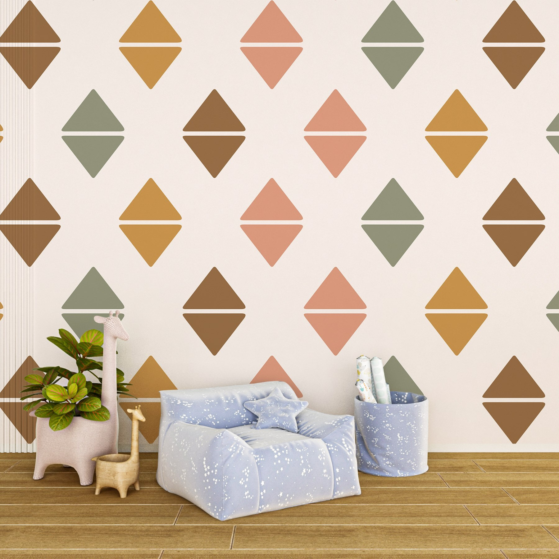 Vstupte do světa, kde zdi vyprávějí příběhy a kde je tato nástěnná malba hlavní postavou. Se svým hravým vzorem barevných diamantů přináší hřejivou a příjemnou atmosféru, která si přímo říká o pozornost. Představte si, že popíjíte kávu ve sluncem ozářené místnosti, jemné odstíny zjemňují rohy a vše působí o něco útulněji. Hosté se možná dokonce zdrží o něco déle, přitahováni těmito rozkošnými tvary – kdo by si nechtěl povídat o tomto poutavém designu? Je to jako rozkošné překvapení, které promění obyčejnou stěnu ve veselé pozadí pro každodenní životní okamžiky. Ideální do obývacích pokojů, dětských pokojů nebo na neforemnou chodbu, která potřebuje trochu kouzla.