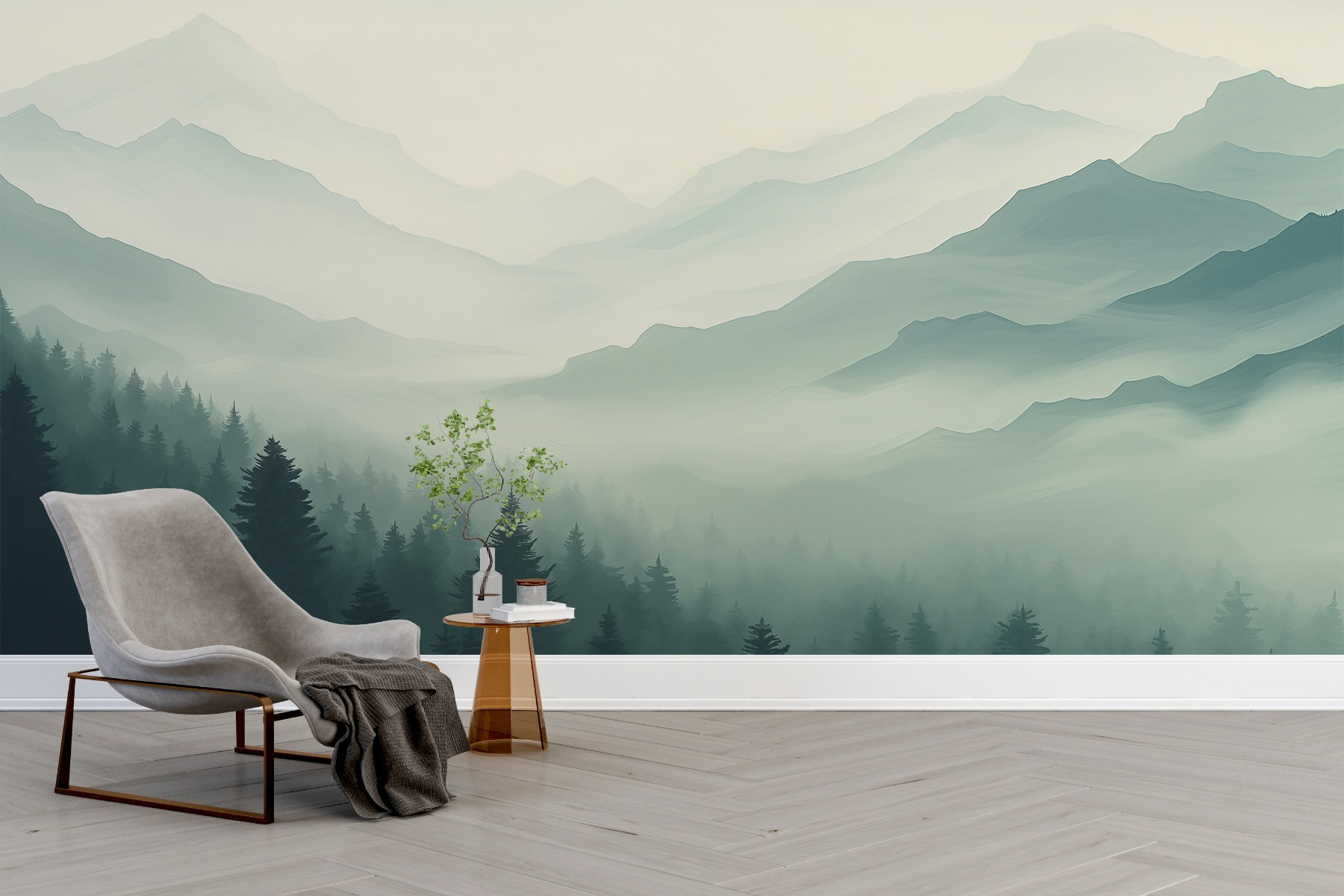 Proměňte svůj prostor pomocí této okouzlující nástěnné malby s mlhavou horskou krajinou políbenou jemnými stromy. Představte si, že se probouzíte do klidných tónů hor, jako by šepot přírody vítal každý den. Jemná mlha zahaluje vrcholky a vytváří téměř snovou kulisu – ideální pro útulná rána nebo klidné večery s šálkem čaje.