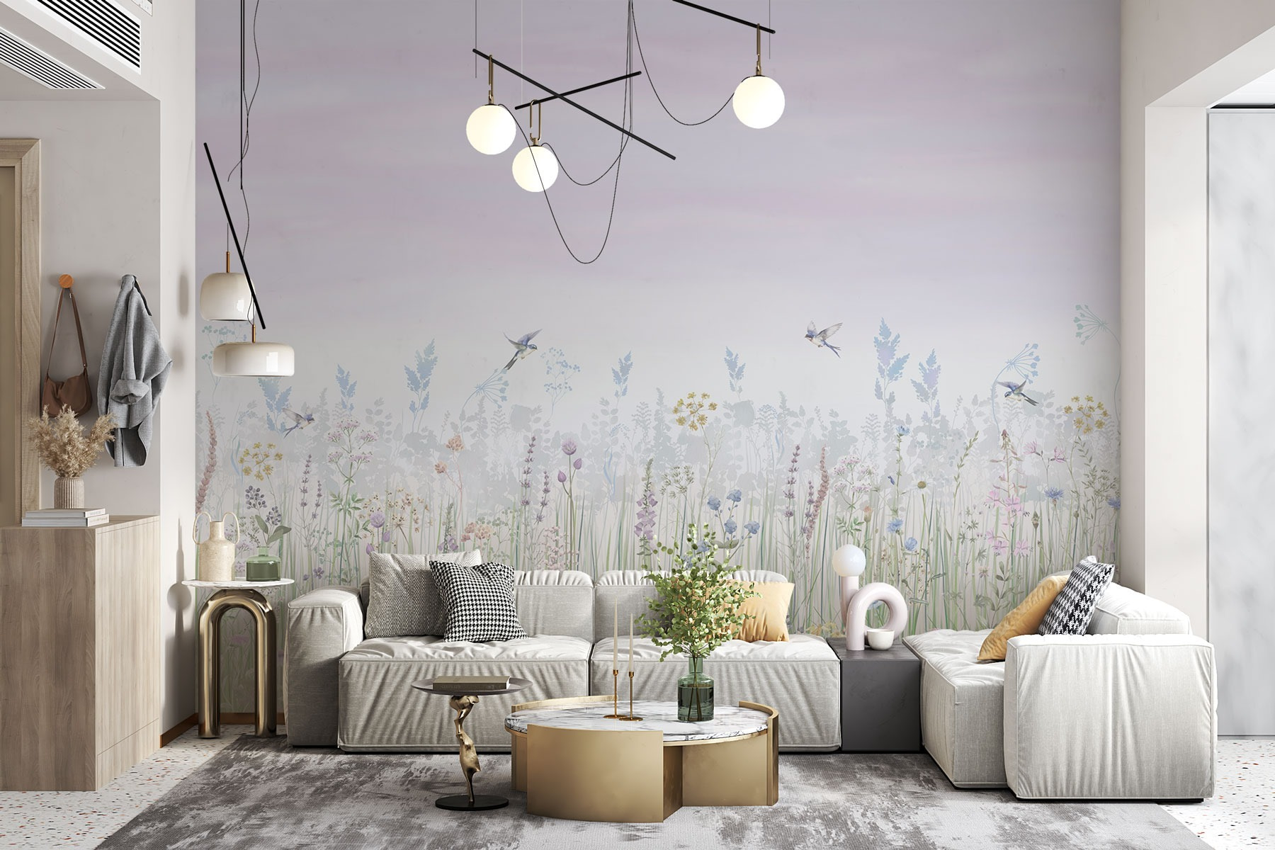 Proměňte každou místnost v klidné útočiště s nástěnnou malbou “Pole květin a ptáků”. Představte si, že vás obklopuje zasněná akvarelová krajina, kde jemné odstíny tančí po stěně jako jemný vánek. Křehké květiny a hraví ptáci vybízejí ke snění a klidným myšlenkám – dokonalé pozadí pro ranní kávové rituály nebo útulné čtecí koutky. Je to jako přenést kousek přírody do interiéru – bez pylu a hmyzu! Ať už odpočíváte po dlouhém dni, nebo hostíte přátele, tato nástěnná malba zahalí váš prostor do tepla a klidu. Nádech rozmarnosti pro každý domov, který slibuje rozjasnit náladu stejně jako první jarní květ.
