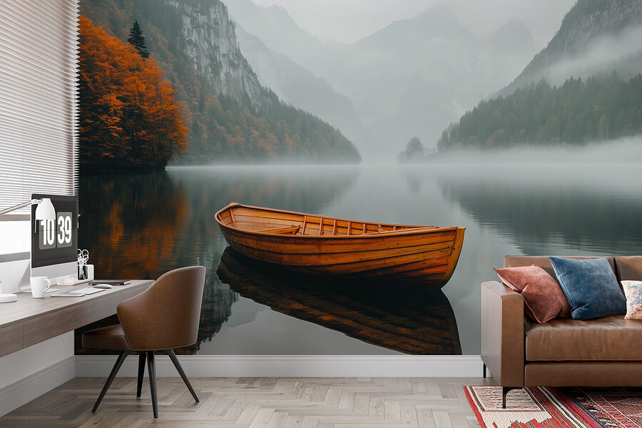 S nástěnnou malbou “Loďka na jezeře” proměníte každou místnost v kousek klidu. Tento úchvatný kus zachycuje klidnou krásu mlhavého jezera, kde se zdá, že jemná dřevěná loďka pluje bez námahy a ozývá se z ní šepot klidu. Představte si, že vstoupíte do svého prostoru a cítíte, jak vás tato klidná atmosféra zaplavuje – jako každodenní mini dovolená! Zářivé oranžové barvy stromů vystupují na pozadí jemné mlhy a jsou pastvou pro oči. Je to jako připomínka, že se máte zastavit, zhluboka dýchat a možná i nasměrovat svého vnitřního průzkumníka. Ideální pro každého, kdo se chce dotknout nádhery přírody bez bláta a postřiku proti hmyzu!
