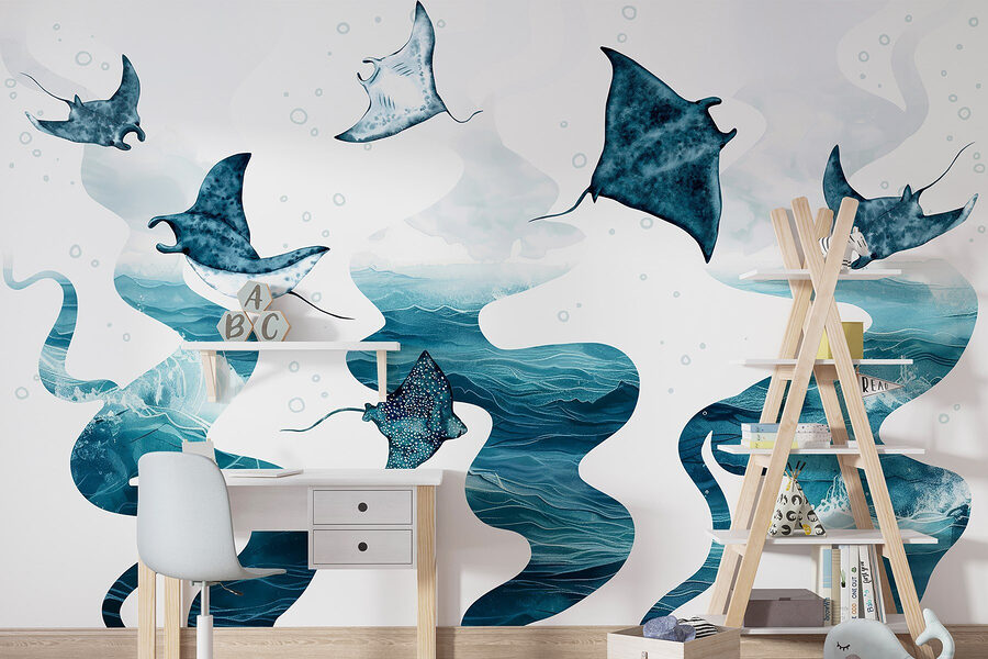 Proměňte jakýkoli prostor v klidné podmořské útočiště díky této úžasné nástěnné malbě rejnoků ladně klouzajících po vodě. Představte si, že vstoupíte do místnosti, kde uklidňující modrá barva vytváří klidnou atmosféru, téměř jako na mini dovolené přímo u vás doma. Díky nenucenému plynutí designu se vám bude zdát o vlnách oceánu a jemném vánku, takže je ideální pro plážový koutek nebo pohodový obývací pokoj. Navíc, kdo by neměl rád rejnoky? Jsou jako jemní mořští obři, kteří na vaše stěny vnesou nádech zázraku a kapku osobitosti. Není to jen dekorace, je to každodenní připomínka krásy přírody, nenápadně inspirující k relaxaci a snění o útěku k moři. Ponořte se do této nástěnné malby a nechte svou fantazii volně plout!