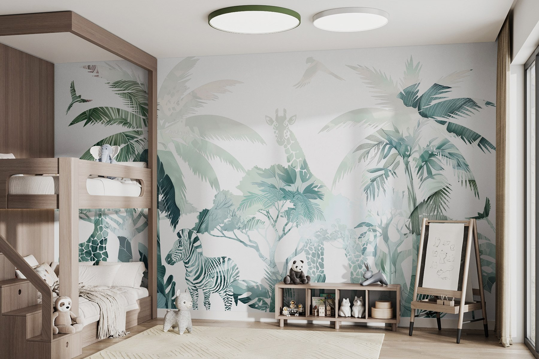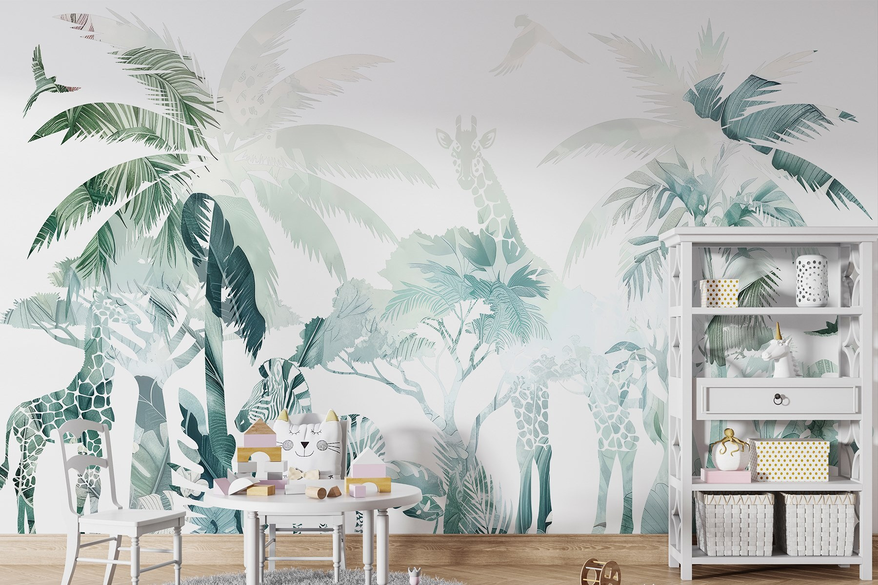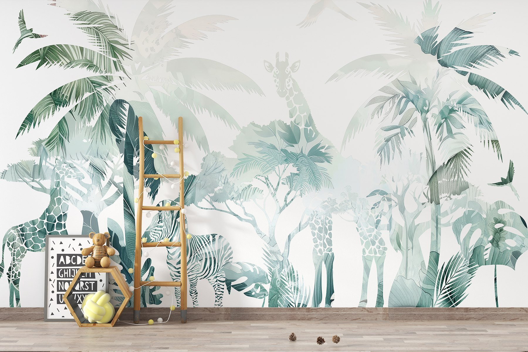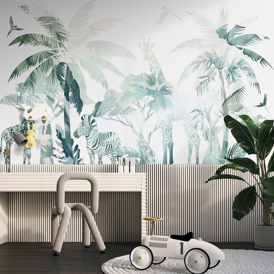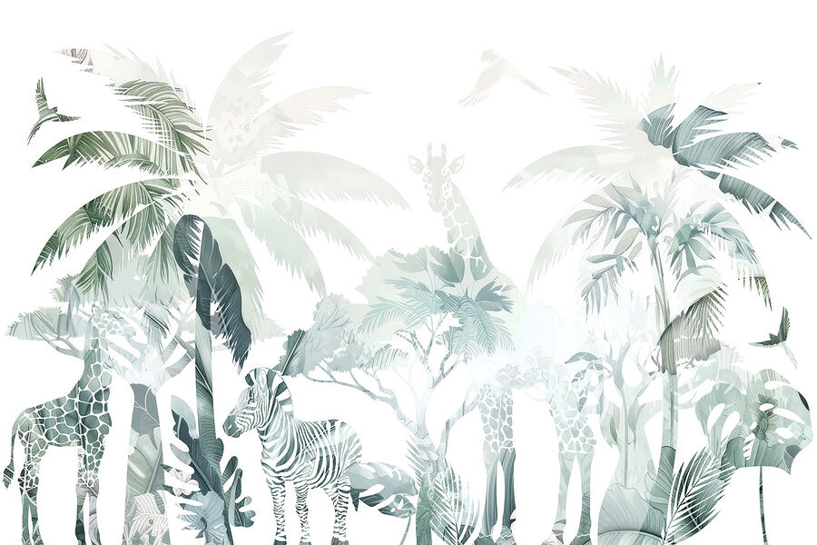 Proměňte svůj prostor v klidné útočiště s touto úžasnou nástěnnou malbou se skupinou zvířat v bujném lese. Představte si, že se každý den procházíte klidnou džunglí – jak skvělé to je? Tato fototapeta spojuje něžné žirafy, hravé zebry a živé palmy, a dodává tak vašemu domovu nádech kouzla přírody. Perfektně se hodí do útulného obývacího pokoje nebo hravého dětského pokoje a vybízí k pocitu dobrodružství a tepla. Navíc si jen představte, jak zábavné by bylo vysvětlovat přátelům, proč se vám v chodbě poflakuje zebra! Jednoduchý způsob, jak podnítit představivost a vyvolat radost v každodenním životě.