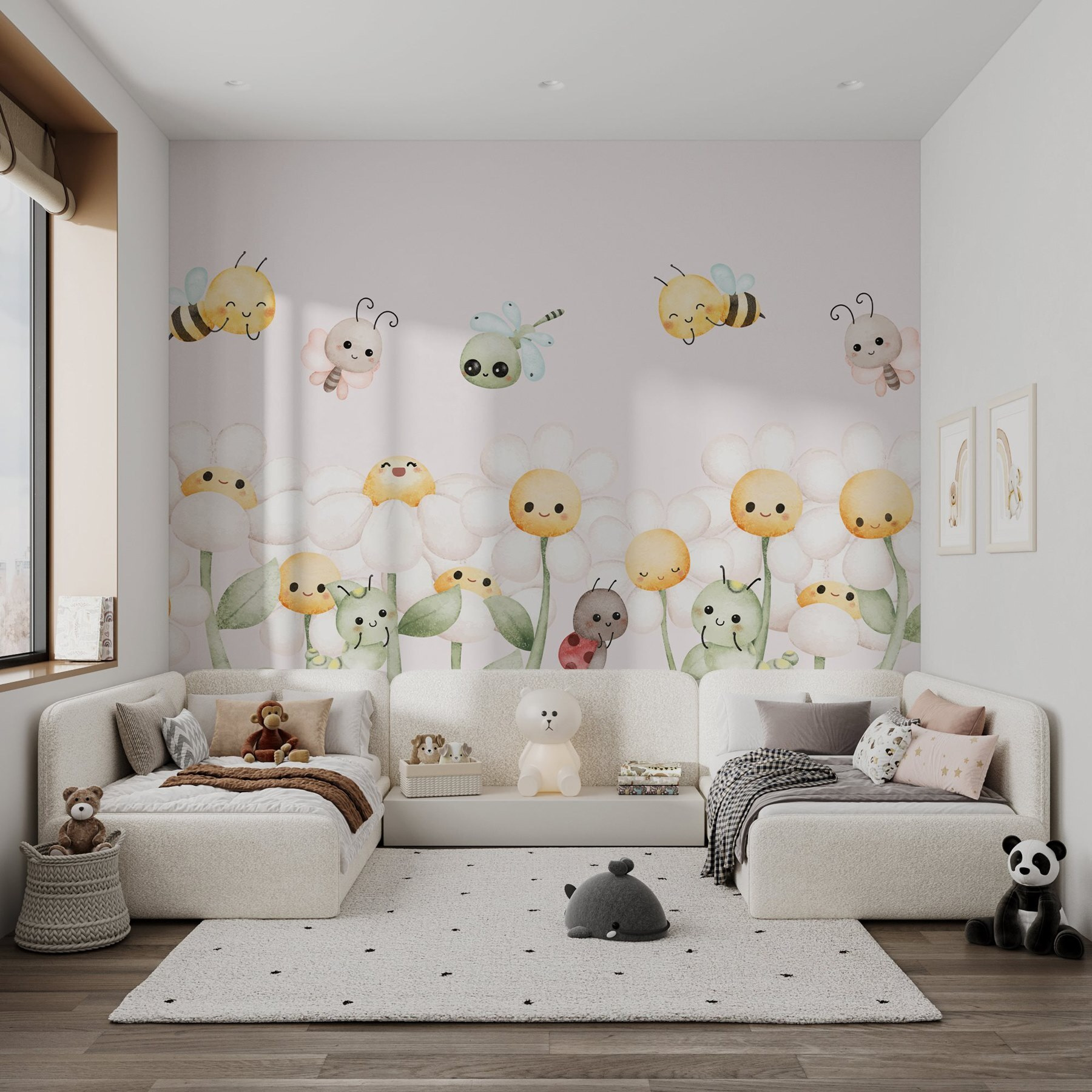 S touto nádhernou nástěnnou malbou kreslených brouků a květin proměníte každou místnost v rozmarnou zahradu. Představte si malé včelky, jak radostně bzučí, zatímco se veselé sedmikrásky pohupují v jemném vánku – je to jako přenést si kousek přírody přímo na zeď! Jasné barvy a roztomilé postavičky dodávají nástěnné malbě hravý nádech, takže se skvěle hodí do dětských pokojů nebo i jako zábavný doplněk útulného zákoutí. Stačí si představit deštivé odpoledne a už popíjíte čaj, zatímco tato veselá zvířátka rozjasňují váš prostor. Kdo by řekl, že dekorace může být tak povznášející? Ideální pro šíření úsměvů!