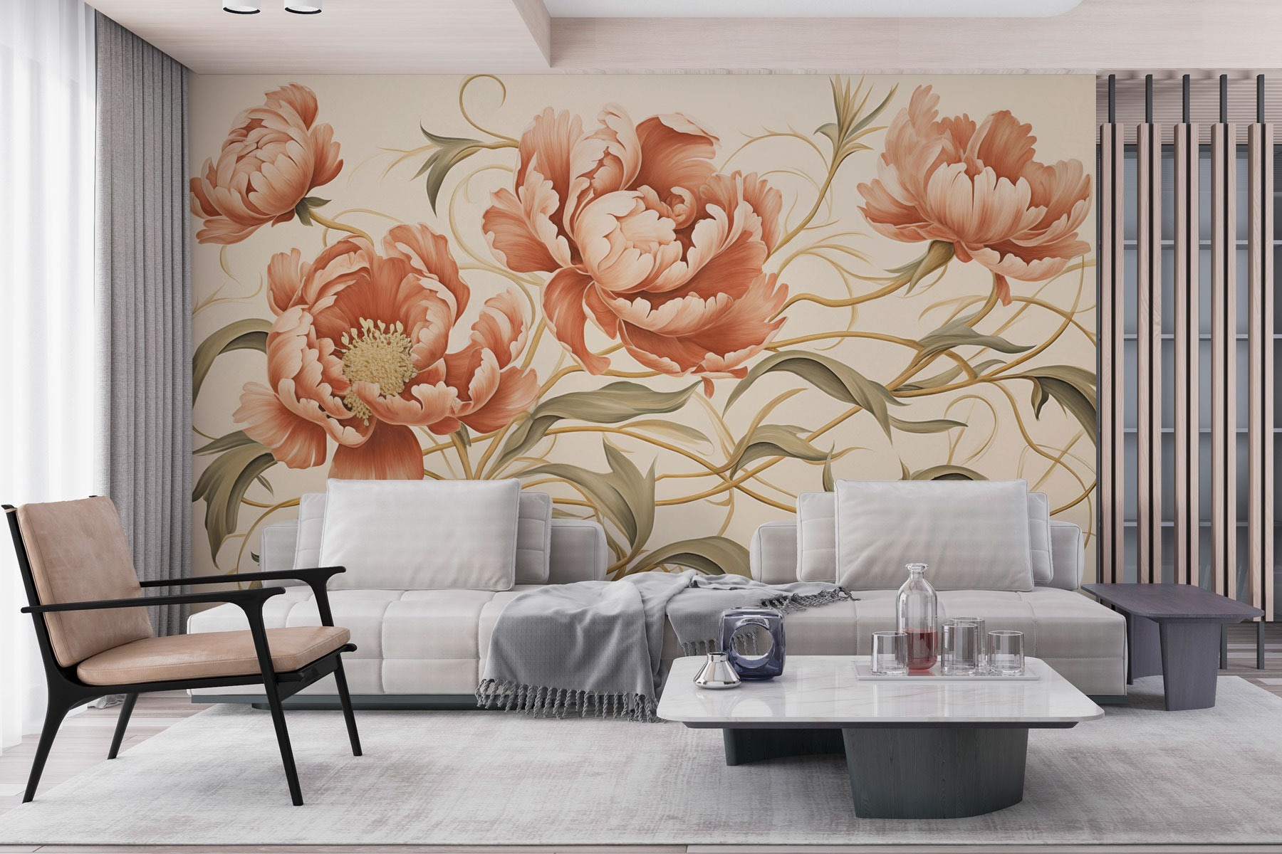 Proměňte každou místnost v útulné botanické útočiště pomocí této úžasné nástěnné malby s květinami a vinnou révou. Představte si to – sluneční světlo proudí dovnitř a tyto krásné pivoňky v jemných růžových a broskvových odstínech tančí na teplém pozadí. Je to jako přenést si do interiéru malou zahrádku bez starostí se zaléváním!