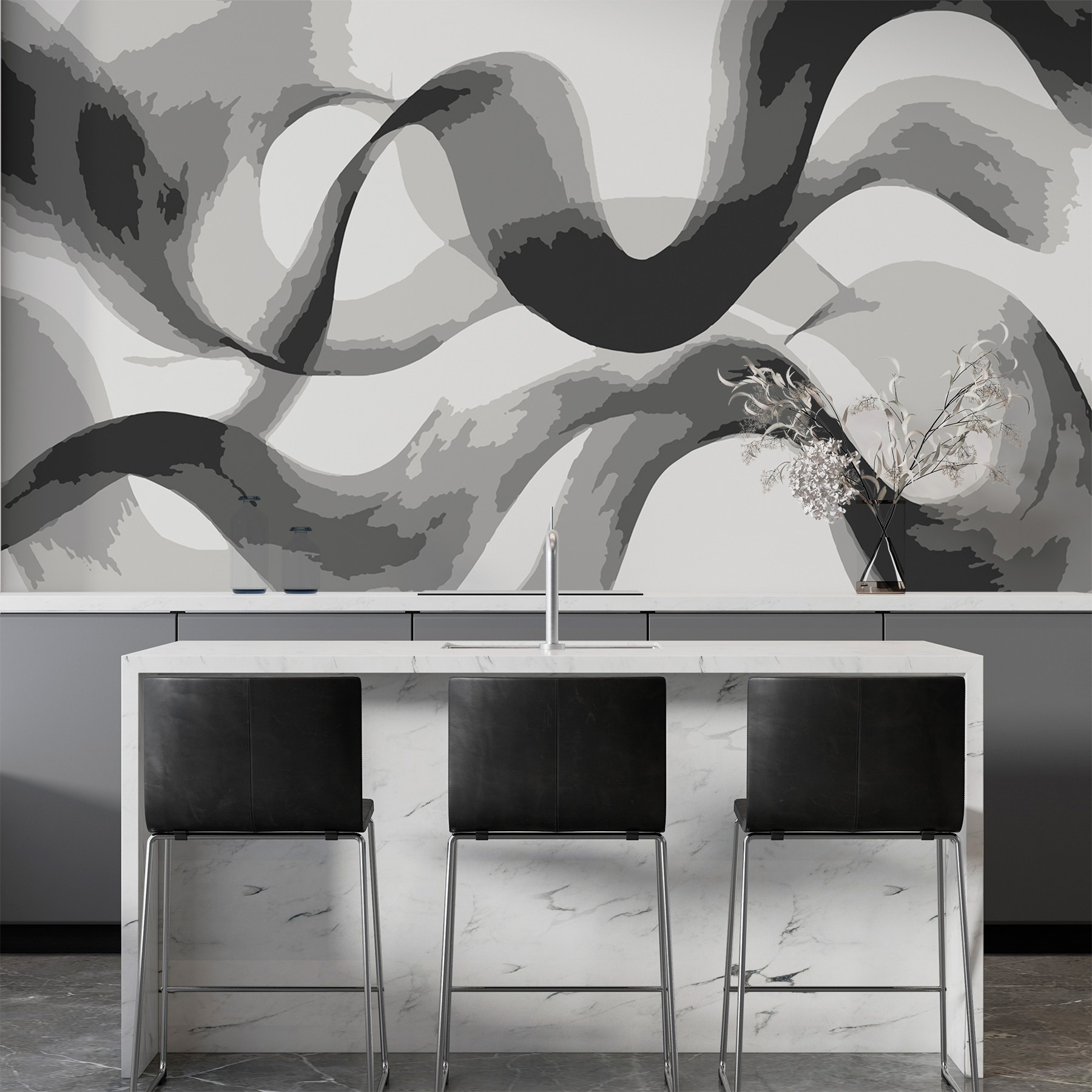 Proměňte svůj prostor pomocí této úžasné “Nástěnné malby šedobílé vířivé linie”. Představte si, že vstoupíte do místnosti, která působí moderně a zároveň přívětivě, kde kolem stěn tančí jemné křivky šedé a bílé barvy. Je to jako zahalit svůj domov do útulné, stylové šály!