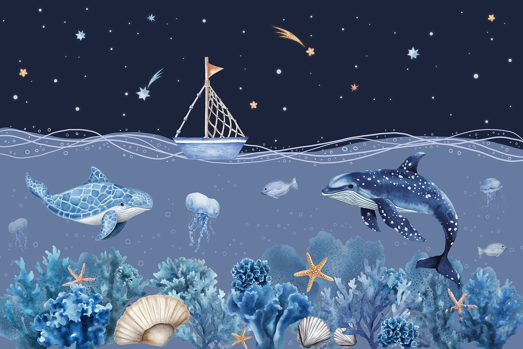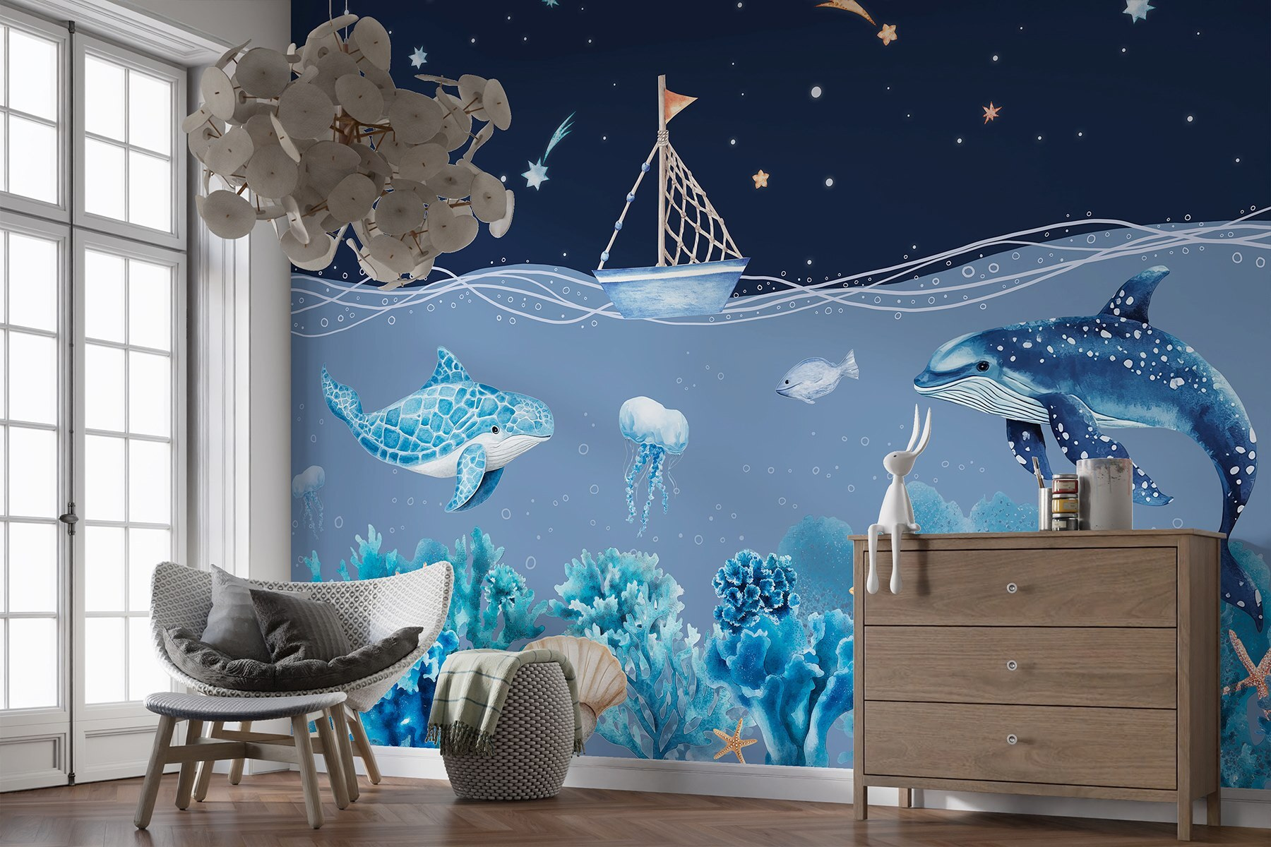 S nástěnnou malbou “Mořský život s lodí a velrybou” proměníte každou místnost v klidné podmořské útočiště. Představte si hravou velrybu, která klouže po zasněném moři, zatímco nad ní pluje okouzlující loď. Je to jako mít kousek oceánu přímo na zdi. Chladná modř a jemná zeleň zahalí prostor do uklidňujícího objetí, takže ranní káva bude působit jako chvíle v ráji. Tato nástěnná malba, která se skvěle hodí do dětského pokoje nebo do útulného čtecího koutku, jistě podnítí fantazii. Bonusové body za vyprávění příběhů – kdo by se nechtěl ponořit do příběhů o dobrodružství na širém moři? Ponořte se a nechte své stěny ožít!