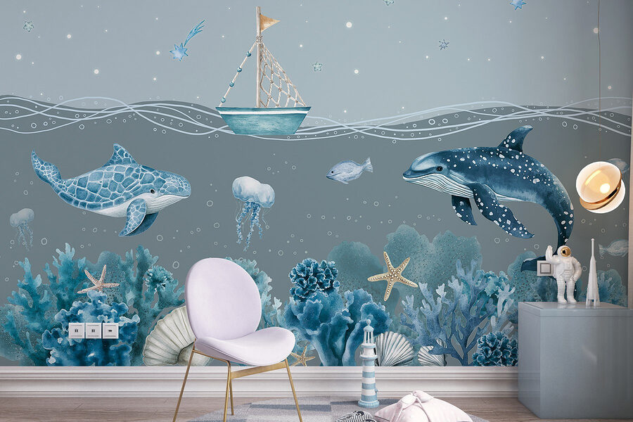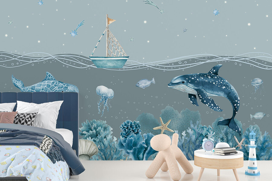 Proměňte svůj prostor v klidné podmořské útočiště s nástěnnou malbou “Sea Life”. Představte si, že se každý den probouzíte a po stěnách vám tančí hraví delfíni a něžné medúzy. Tento snový výjev zachycuje okouzlující lodičku klouzající po klidném moři, obklopenou zářivými korály a hvězdicemi. Je to jako mít doma kousek oceánu – bez slaných vlasů! Tato nástěnná malba, která se skvěle hodí do dětského pokoje nebo třeba do útulného čtecího koutku, přináší nádech rozmarnosti a klidu. Nechte se unášet barvami, které vytvářejí klidnou atmosféru, jež může inspirovat snění o oceánských dobrodružstvích.