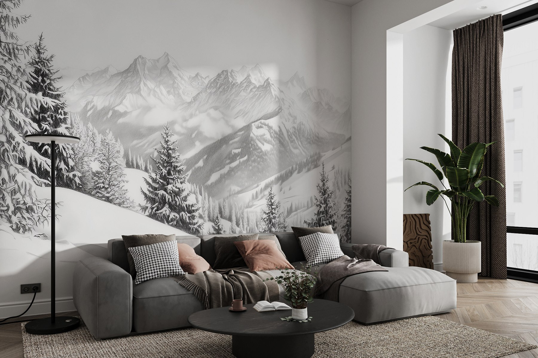 S touto úžasnou nástěnnou malbou zasněžených hor a majestátních stromů proměníte každou místnost v klidné zimní útočiště. Představte si, jak se uvelebujete s horkým nápojem a díváte se na úchvatnou krajinu, která se zdá být jen kousek od vás. Klidná bílá a jemná šedá evokují klid, který vás obklopí jako hřejivá deka – ideální pro chladné noci. Dodejte svým stěnám nádech divočiny a nechte svůj prostor dýchat čerstvým horským vzduchem. Tato nástěnná malba je ideální pro milovníky přírody i snílky a vybízí ke klidným myšlenkám a pocitu dobrodružství i z pohovky.