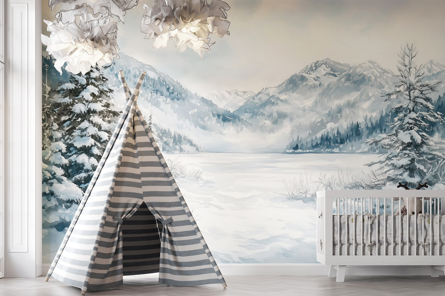 Fototapeta Zasněžená krajina se stromy a horami Fototapeta Zasněžená krajina se stromy a horami
