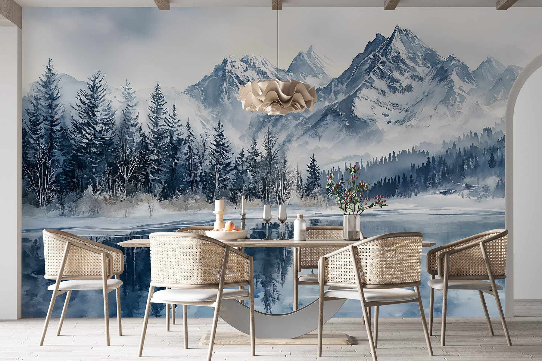 Proměňte svůj prostor v zimní říši divů s touto úžasnou nástěnnou malbou klidného jezera obklopeného zasněženými horami a stromy. Jemný akvarelový efekt navozuje klidnou atmosféru, která je ideální pro útulné posezení s šálkem čaje nebo pro předstírání, že jste na jeden den horským hlídačem. Představte si, že sledujete tanec slunečních paprsků na vodě, zatímco vám dělají společnost tyto vrcholky. Je to malý kousek přírody přímo ve vašem obývacím pokoji. Navíc je na sněhu něco, co vše osvěží a zklidní. Kdo by to nechtěl? Udělejte si ze svých stěn plátno snů a nechte se ztratit v kráse zimy, a to po celý rok!