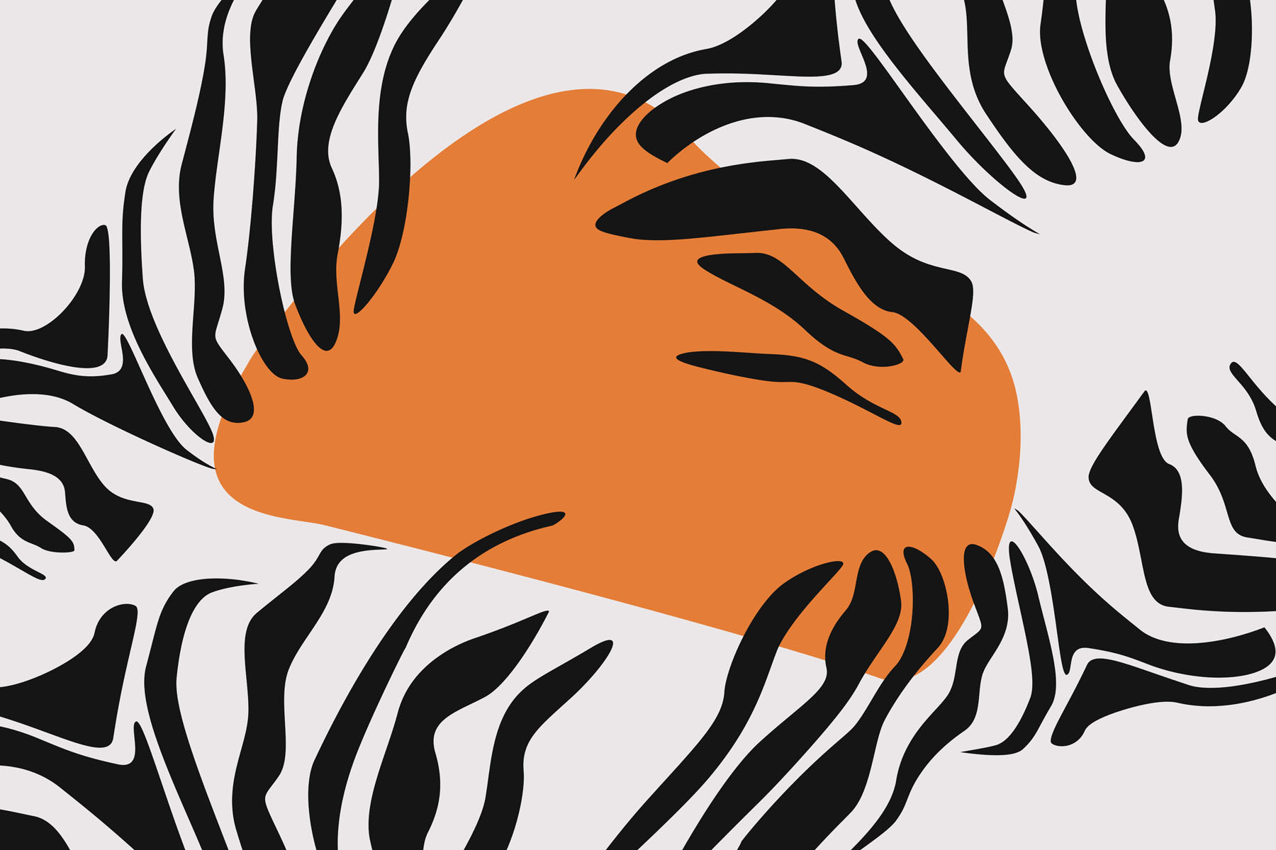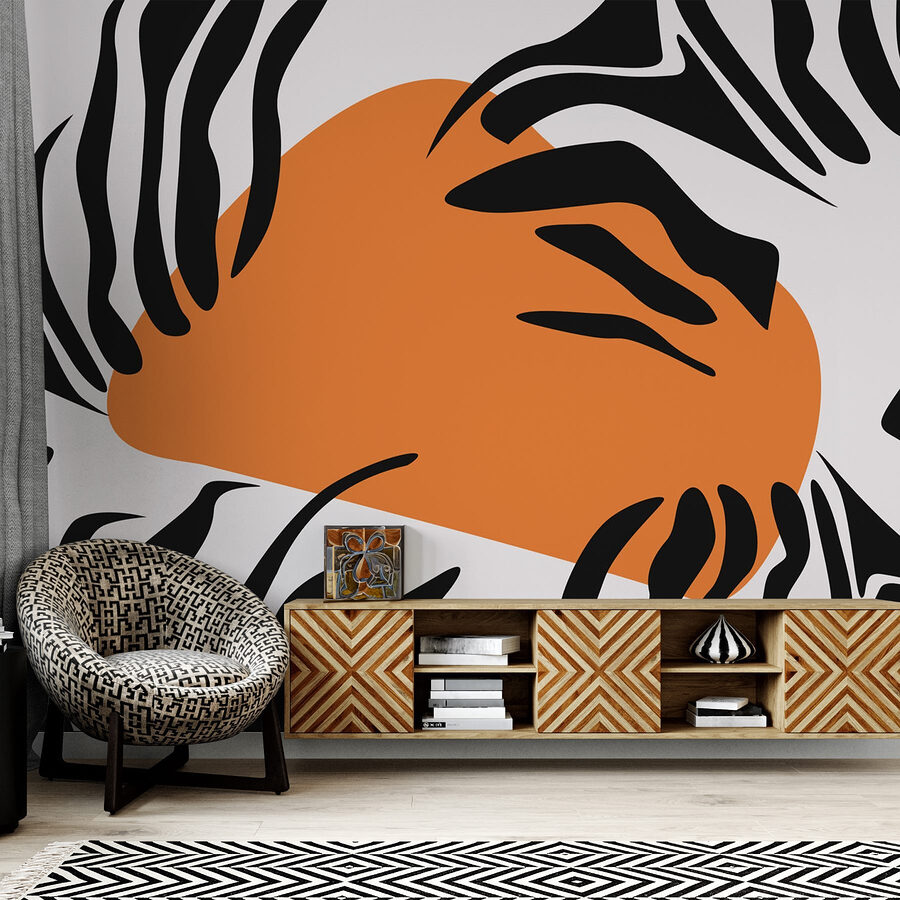 Proměna prostoru může někdy připomínat kouzelnický trik a tato nástěnná malba přesně to dokáže. “Dynamické vzory v odvážných barvách” stříkají energickou atmosféru, která donutí každého udělat dvojí záběr. Představte si živé černobílé pruhy propletené s nádechem zářivé oranžové – jako by vás dílo zvalo na hravou džungli přímo ve vašem obývacím pokoji.