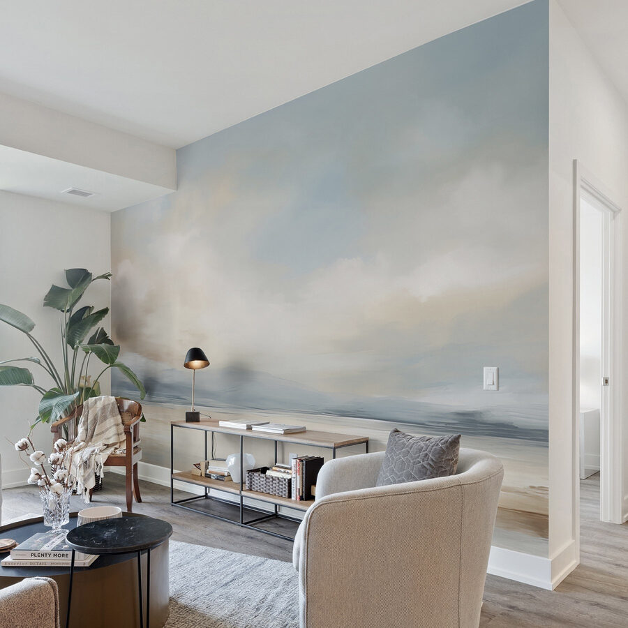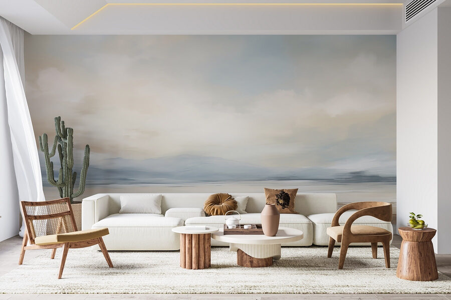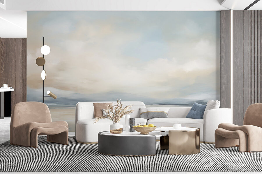 Proměňte svůj prostor pomocí této klidné nástěnné malby “Krajina s vodní plochou a mraky”. Představte si, že vejdete do místnosti, kde uklidňující barvy šeptají klid a nad hlavou plují jemné mraky. Tato fototapeta vás vtáhne do zasněného přímořského úniku – ideální pro případy, kdy doma nemůžete mít výhled na oceán. Představte si, jak popíjíte kávu, díváte se na tuto rozlehlou, klidnou krajinu a cítíte, jak se váš stres rozplývá. Je to jako každodenní mini dovolená! Ideální do obývacího pokoje nebo útulného zákoutí, vybízí k relaxaci, konverzaci a možná i ke snění. Kdo by to nechtěl?