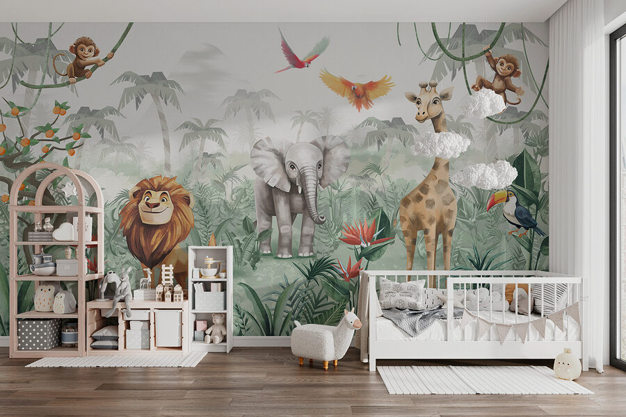 S touto okouzlující fototapetou proměníte každý prostor v živoucí dobrodružství v džungli! Představte si slona a veselého lva, jak dovádějí mezi přáteli, jako jsou opice a barevní ptáci – je to jako party na vaší zdi! Tato fototapeta přináší pocit radosti a zázraku a je ideální pro rozproudění dětské představivosti nebo jako hravý doplněk do každého pokoje. Představte si útulné čtecí koutky, kde malé děti objevují nové světy, nebo veselé herny, které se cítí jako na safari. Je to jako pozvat přírodu přímo k vám domů – bez špinavého úklidu!
