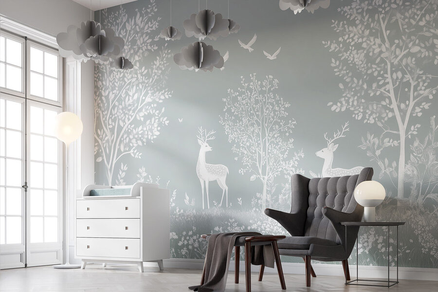 Proměňte svůj prostor v klidné útočiště s touto okouzlující nástěnnou malbou s půvabnými bílými jeleny, kteří se potulují v měkkém listnatém lese. Představte si, že vstoupíte do svého pokoje a budete mít pocit, že jste se zatoulali do zasněného lesa plného jemného šepotu přírody. Jemní ptáčci poletující nad ním dodávají nádech rozmarnosti a jsou dokonalou kulisou pro útulné večery nebo inspirativní rána. Je to jako mít klidné útočiště přímo doma! Ať už popíjíte čaj nebo si čtete knihu, tato nástěnná malba vybízí k těmto sladkým chvilkám klidu. Navíc je to skvělý začátek konverzace – kdo by si nechtěl povídat o svém tajném lese?