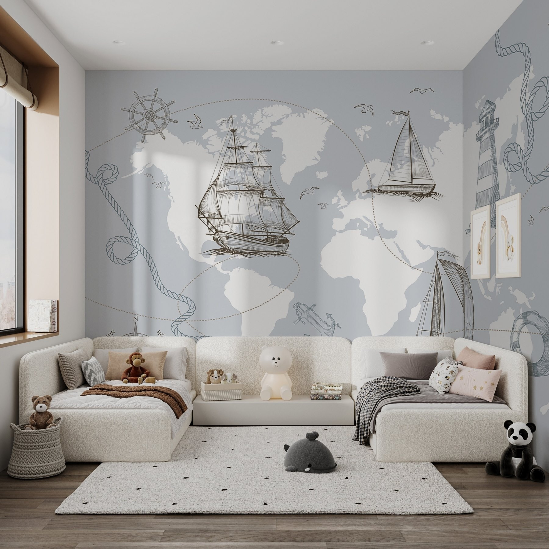 S touto okouzlující fototapetou s mapou světa, doplněnou rozmarnými loděmi a majákem, proměníte každý pokoj v námořnické útočiště. Představte si příběhy, které by tato plavidla mohla vyprávět, když plují po nekonečných mořích. Ideální pro vytvoření útulného koutku, kde můžete snít o dobrodružstvích nebo se jednoduše zklidnit s knihou. Jemné vzory se bez námahy začlení do různých prostor a dodají jim hloubku a intriky. Přátelé budou obdivovat tento jedinečný dotek, a kdo ví, možná je dokonce inspiruje ke spontánnímu cestovatelskému plánu nebo dvěma! Ukotvěte tedy tyto rozmarné vibrace přímo u vás doma.