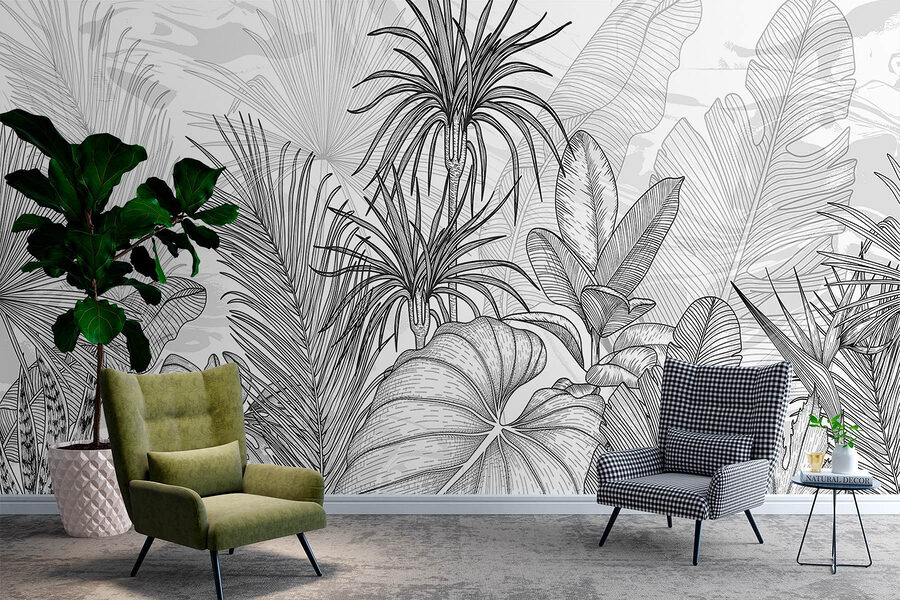 Proměňte svůj prostor pomocí této úžasné černobílé nástěnné malby, která zachycuje složitou krásu tropických rostlin. Představte si, že při každém vstupu do místnosti vstoupíte do klidné džungle. Tyto obrysy listů jsou jako stylová tajná zahrada, která doplní jakýkoli dekor – ideální pro vytvoření útulného čtecího koutku nebo živého jídelního koutu. Kontrast odvážných tvarů na jemném pozadí vybízí k hravé představivosti. Nechte se inspirovat něžnou krásou přírody k odpočinku, a kdo ví? Vaši přátelé si možná budou myslet, že máte doma mini deštný prales.