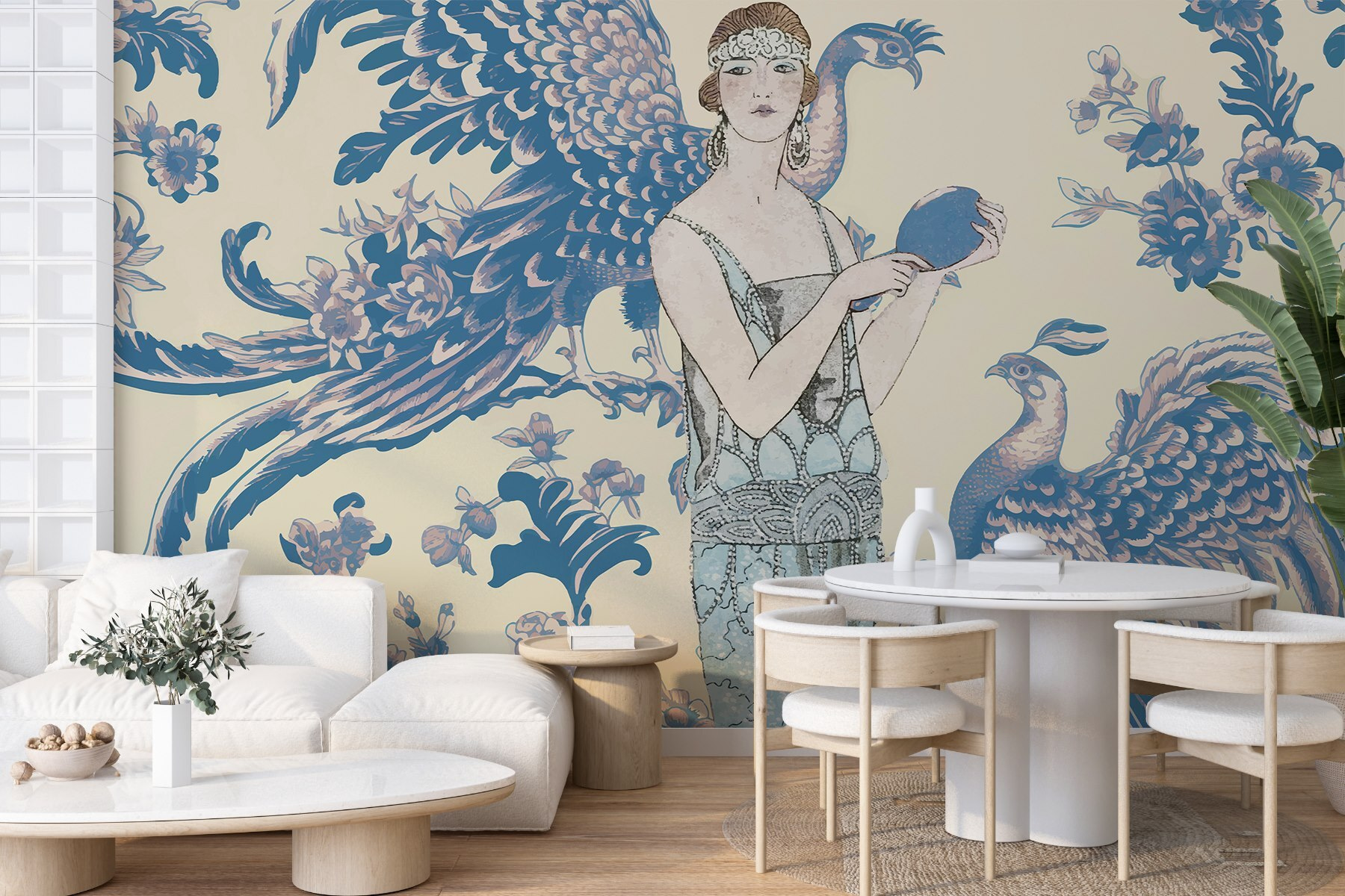 Vylepšete svůj prostor touto úžasnou nástěnnou malbou s půvabnou ženou držící kulatý modrý předmět, obklopenou rozmarnými pávy a jemnými květinami. Je to, jako byste měli přímo na zdi kus snového umění! Představte si, že se každý den probouzíte s touto sprškou barev a elegance – ideální pro navození klidné atmosféry. Ať už v útulném koutku nebo v elegantním obývacím pokoji, tato nástěnná malba vás zve do světa krásy. Hosté neodolají jejímu obdivu a možná vás inspiruje ke spontánní konverzaci o umění, cestování nebo o nepolapitelných pávích – protože kdo by neměl rád trochu půvabu?