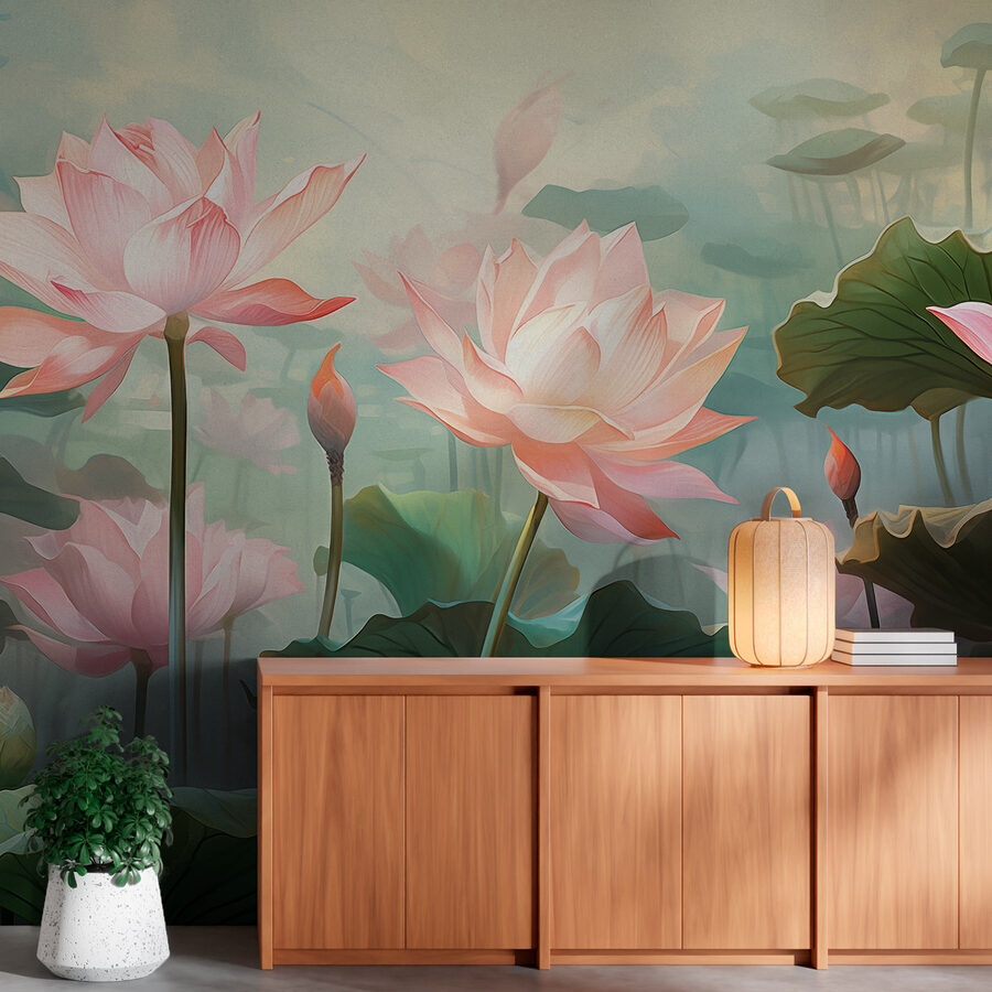 Proměňte každou místnost v oázu klidu díky této úžasné nástěnné malbě s nádhernou skupinou růžových květů uprostřed svěžích zelených listů. Představte si, že vstoupíte do svého prostoru a pocítíte okamžitý klid – jako jemný vánek v teplém dni. Měkké odstíny a jemné detaily vybízejí k pocitu klidu, takže se skvěle hodí do útulného čtecího koutku nebo třeba do živé kuchyně.
