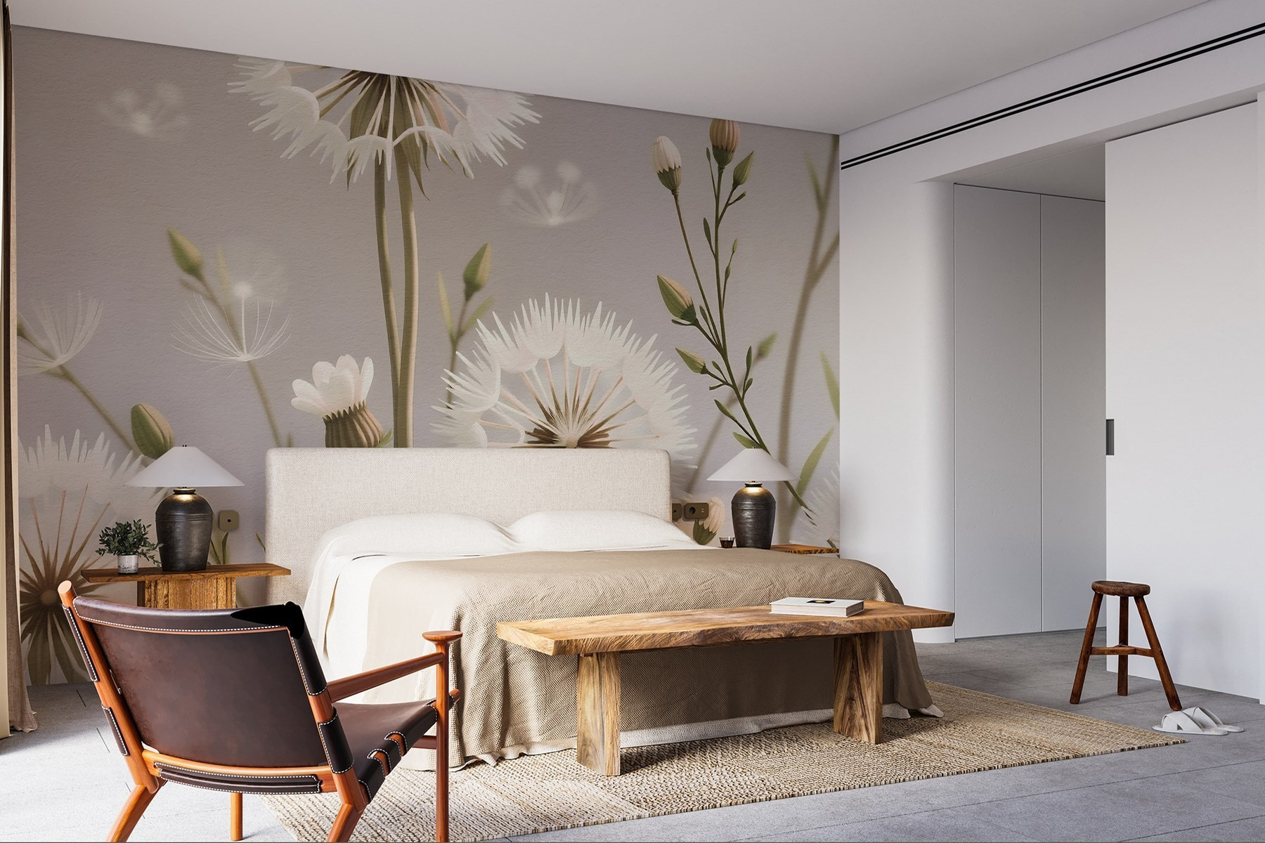 Proměňte svůj prostor pomocí nástěnné malby “Jemné květy v jemné paletě”. Tento krásný design přináší do interiéru dotek přírody a představuje půvabné pampelišky a něžné květy. Představte si, že se probudíte a přivítá vás toto uklidňující umělecké dílo – je to jako jemný šepot ze zahrady!