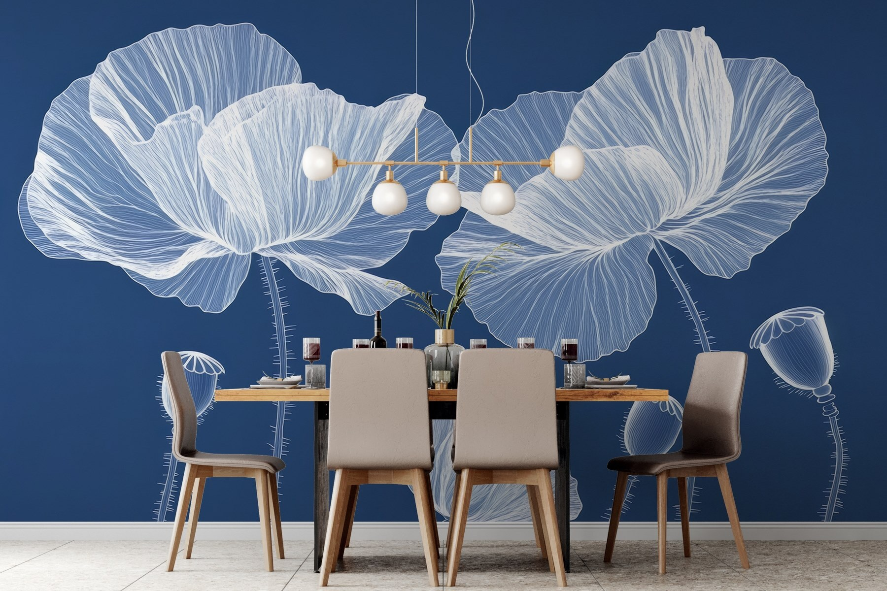 Proměňte svůj prostor v oázu klidu díky této úžasné nástěnné malbě s jemnými bílými květy na sytě modrém pozadí. Šepotá sofistikovanost a zároveň zachovává nenucenost – ideální pro útulný obývací pokoj nebo klidné útočiště v ložnici. Představte si, že vstoupíte do místnosti a cítíte, jak vás ovívá jemný vánek klidu, jako sladký jarní den, který nikdy nemusí skončit. Akvarelový styl dodává obrazu umělecký nádech, takže máte pocit, jako by skrze vaše stěny nahlížela samotná příroda. Přátelé si toho všimnou a možná vám budou i závidět váš dokonalý vkus. Jen si to představte: jedna nástěnná malba, nespočet úsměvů. Kdo by řekl, že zdobení může přinést takovou radost?