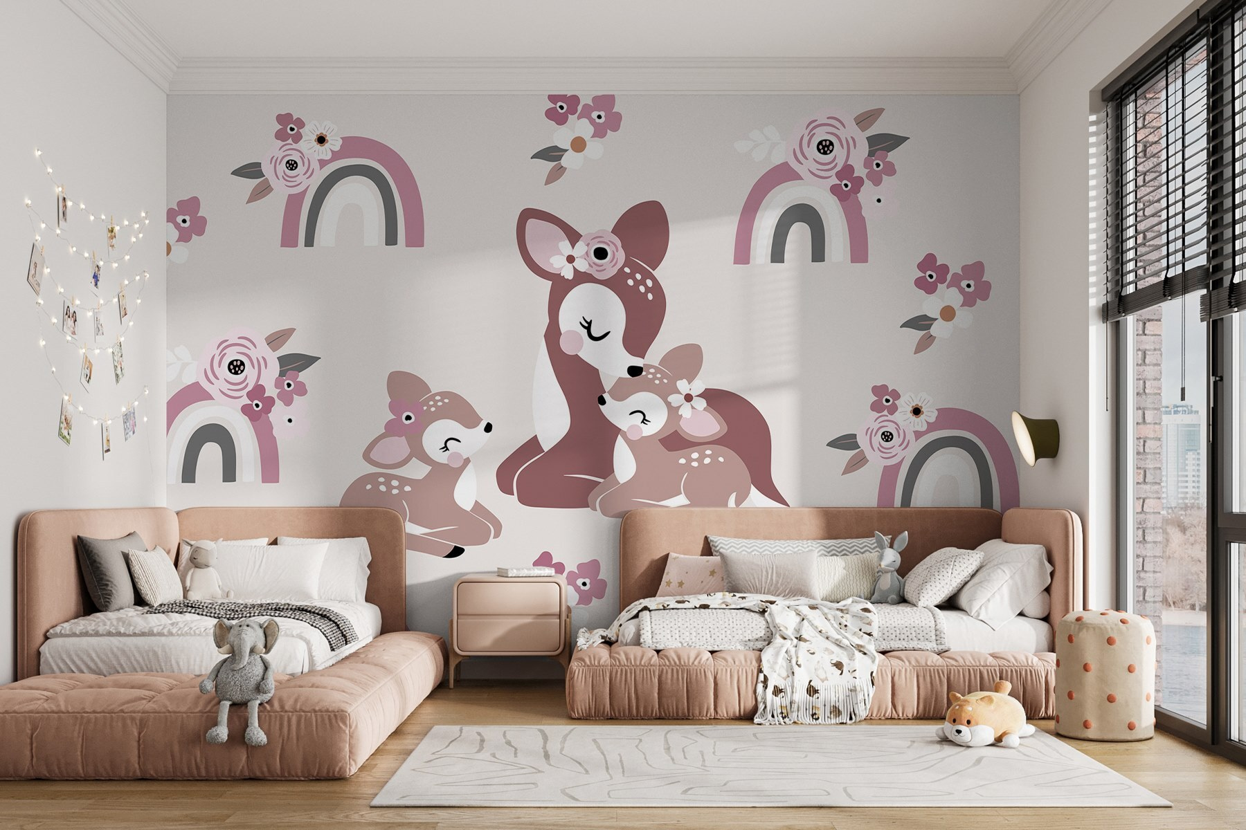 Proměňte svůj prostor v klidné lesní útočiště s touto okouzlující nástěnnou malbou se srdečnou skupinou jelenů a květinovou krásou. Představte si to: sluneční světlo, které proudí dovnitř a vrhá měkké stíny na létající duhy a hravé květiny – je to, jako by se příroda rozhodla zdřímnout si přímo na vaší zdi. Díky jemným barvám a rozkošné jelení rodince, která se k sobě tulí, přináší uklidňující atmosféru, která zahřeje každou místnost. Tato nástěnná malba, která se skvěle hodí do dětských pokojů, dětských pokojíčků nebo i jako hravý akcent v obytných prostorách, vybízí k úsměvům a útulným pocitům. Jen si představte tu radost, když si malé děti ukazují a chichotají se svým novým chlupatým kamarádům! Kdo by řekl, že dekorace na zeď může vyvolat takové štěstí?