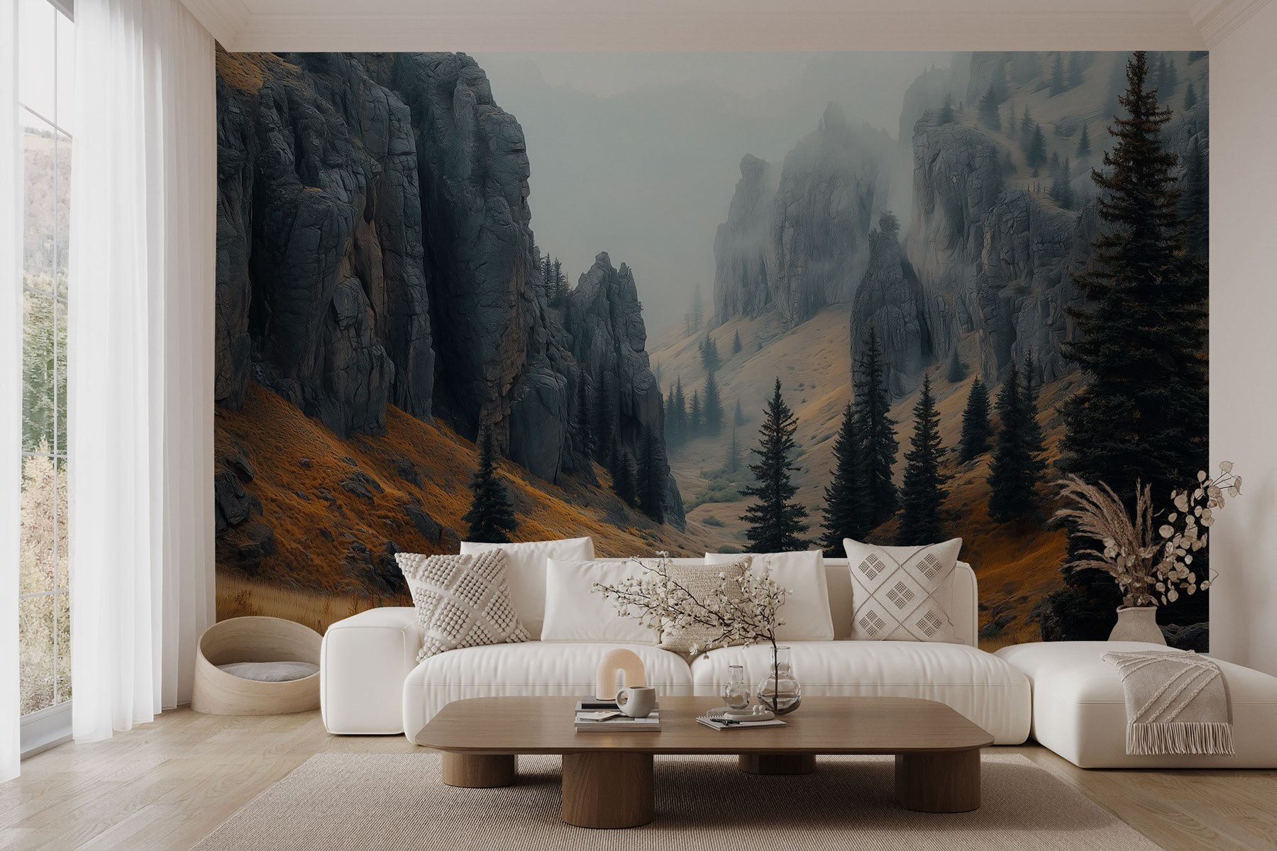 Proměňte každou místnost v útulné horské útočiště pomocí této úžasné nástěnné malby skalnatých hor zahalených v jemné mlze. Představte si, že se místo prázdné zdi probudíte do této klidné krajiny – to je něco, co vám zlepší náladu! Sytě zelená barva stromů vyniká na pozadí zemitých tónů a pozve dotek přírody přímo do vašeho prostoru. Je ideální pro ty, kteří sní o útěku do divočiny, ale přesto ocení teplý šálek kávy doma. Jen si to představte: Nedělní rána strávená popíjením tohoto nápoje, zatímco děti stavějí pevnosti – to je vzpomínka, na kterou se dá vzpomínat! A navíc mlhavá horská atmosféra? Taková atmosféra. Ať už se jedná o obývací pokoj, kancelář nebo třeba meditační koutek, tato nástěnná malba v sobě dokonale spojuje dobrodružství a klid. Je to jako závan čerstvého horského vzduchu bez turistických bot. Tak proč si neudělat malý výlet, aniž byste museli opustit gauč?